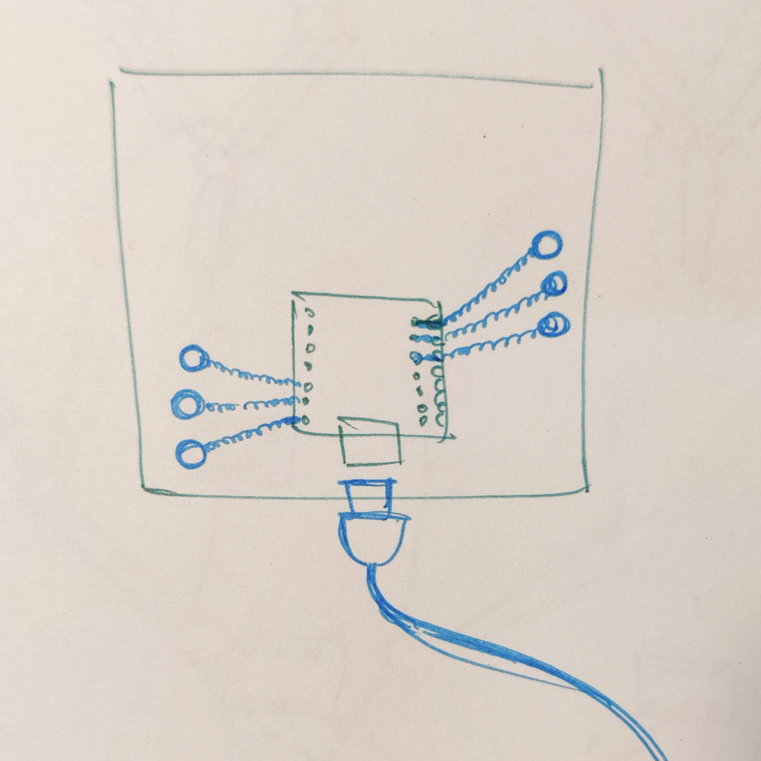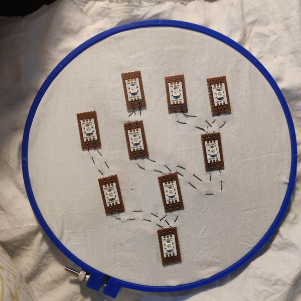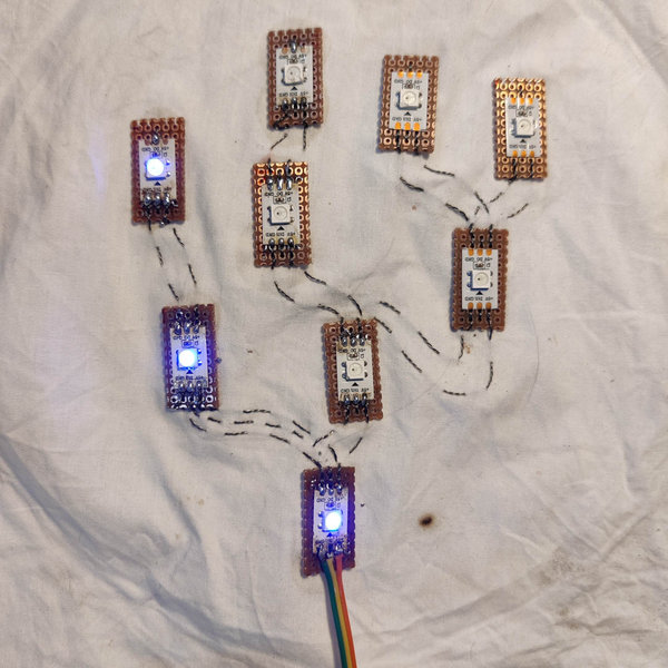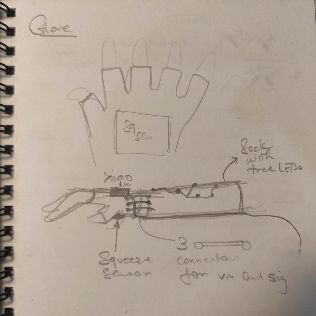 The tree motif would be on a forearm covering vambrace, while the sensor would be in the palm of the glove, to be activated by squeezing. The microcontroller, currently an Arduino Uno, would be the Xiao RP2040, stitched onto the back of the hand.