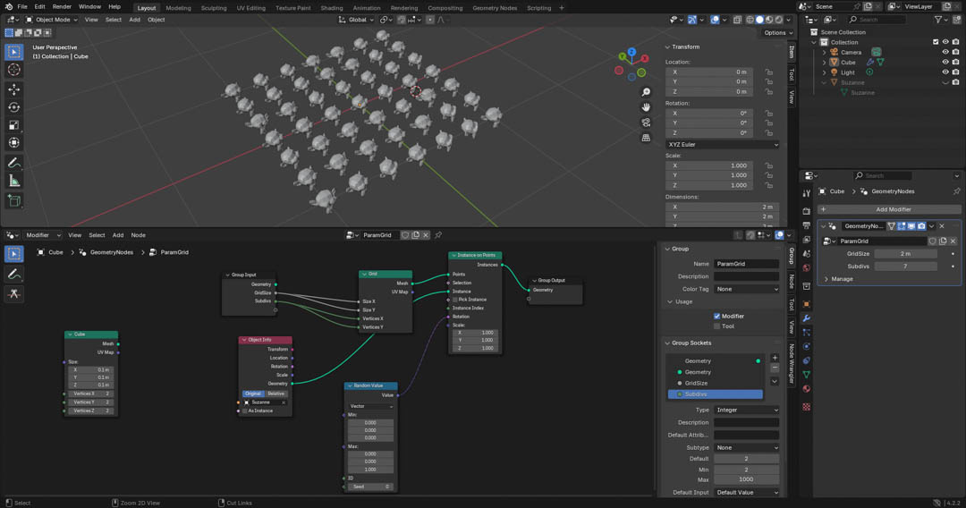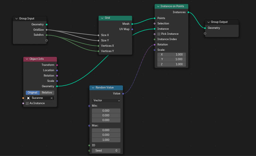 Instancing Suzanne the Monkey across a plane, using Randomness to rotate them across all directions.