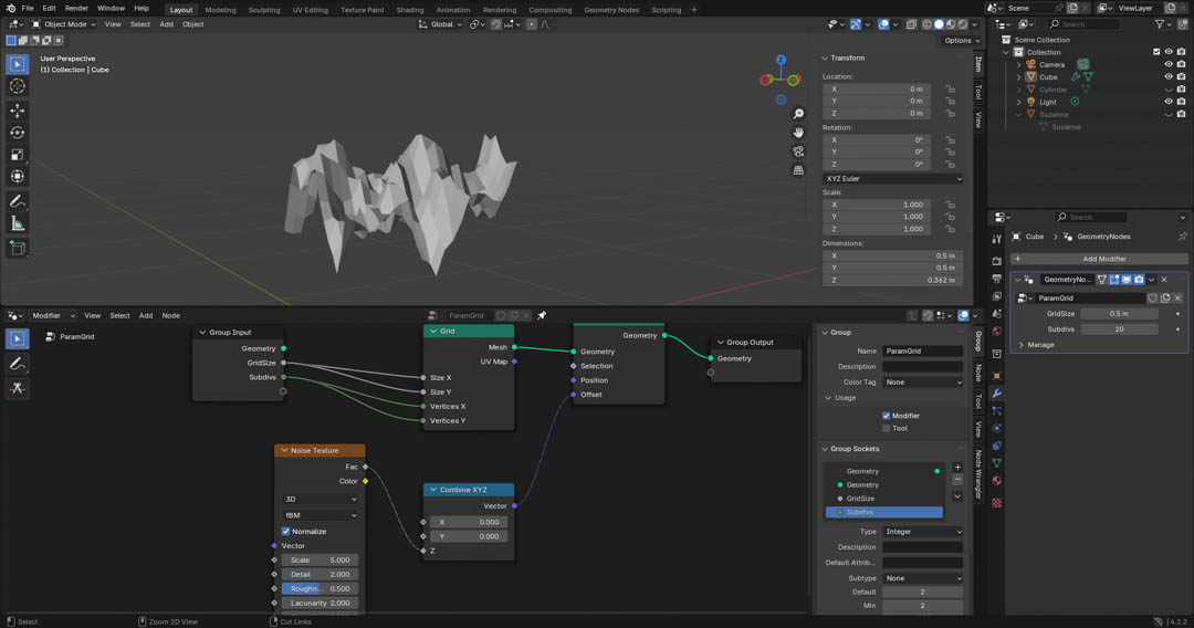 Noise is something I use extensively in p5.js, and almost not at all in Grasshopper. The use of Noise in GN was surprisingly easy.