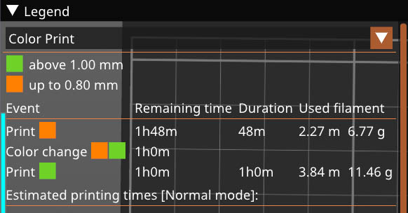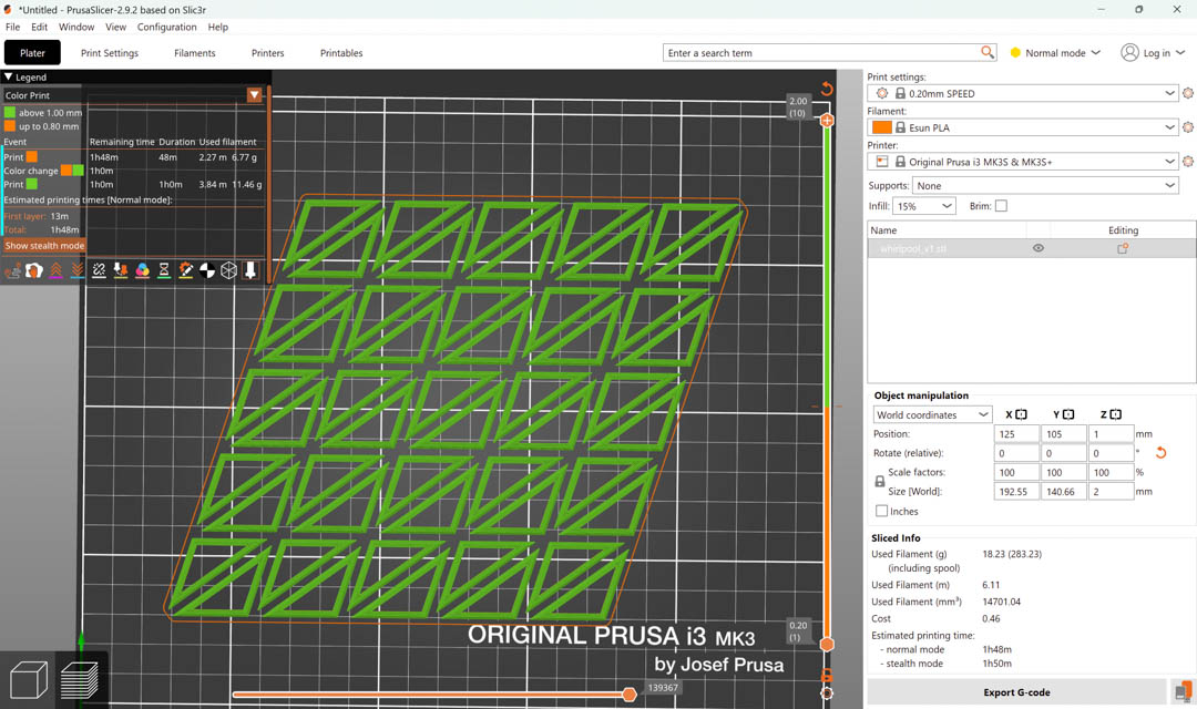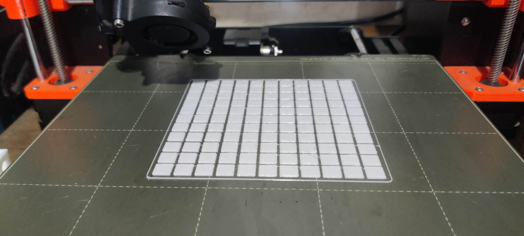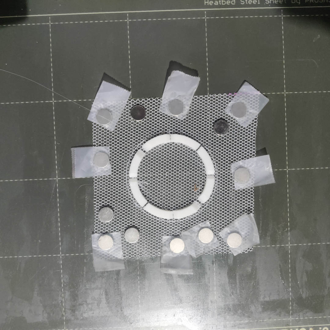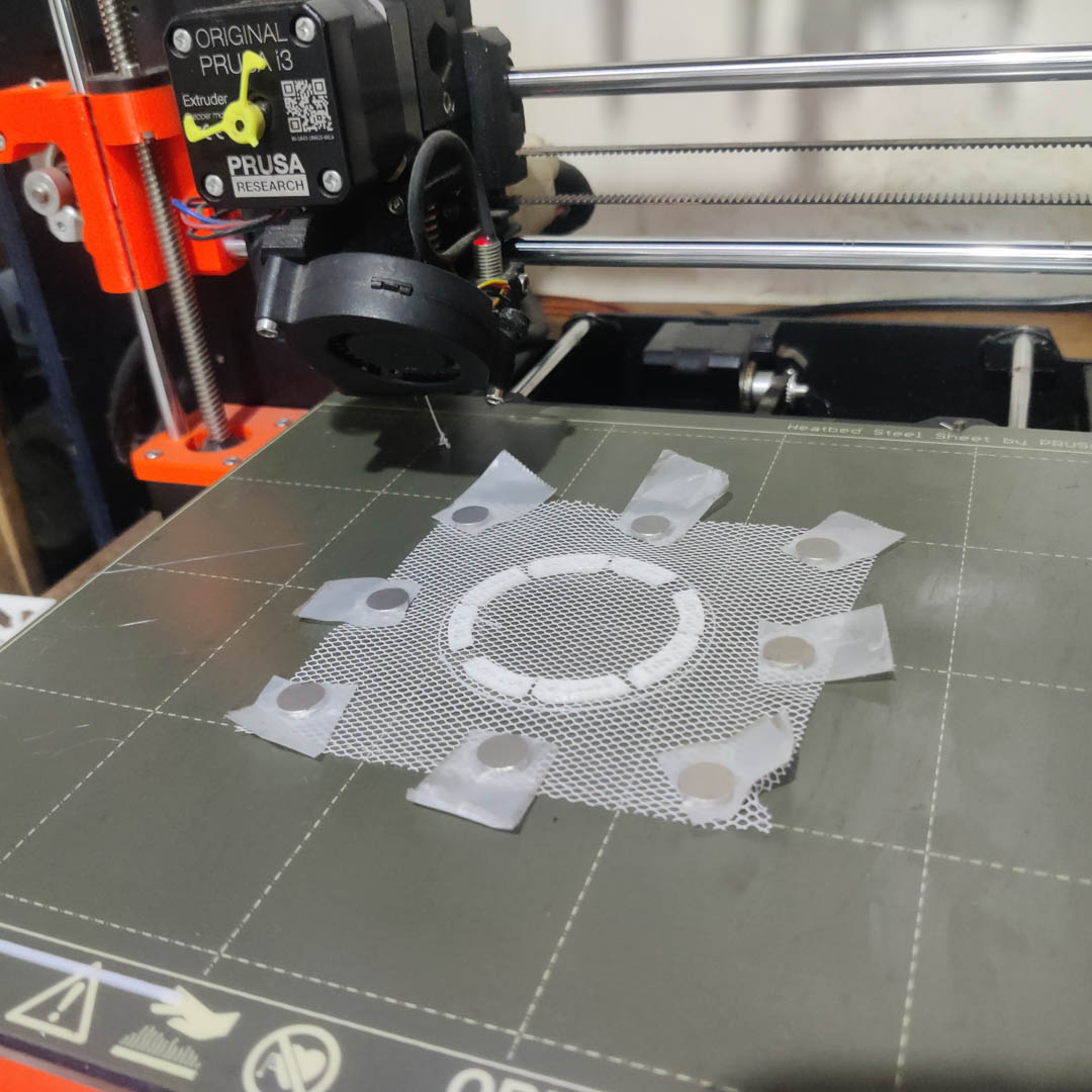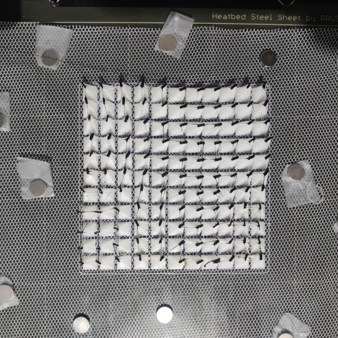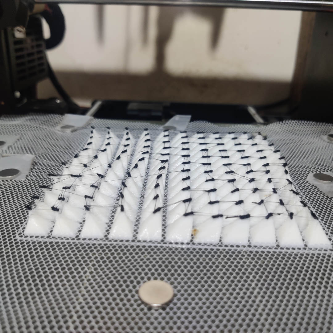 The printing was done using the Sandwich method, with pausing for fabric at about 1 mm height. For the last 2 layers, filament colour was changed to black, to give better contrast against the larger volume.
