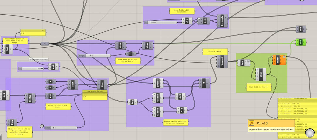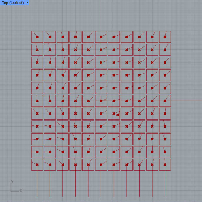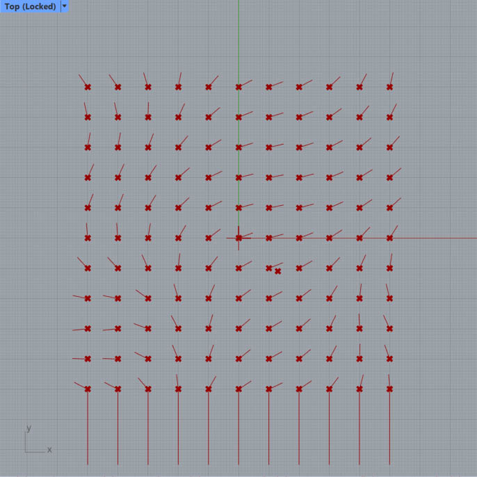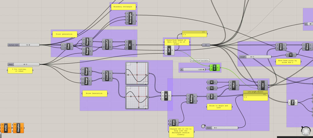 I started by trying to follow the same route in Grasshopper that I would in p5.js, but realised that while the core principle was the same - noise based rotation of a vector - the route to get there would be slightly different.