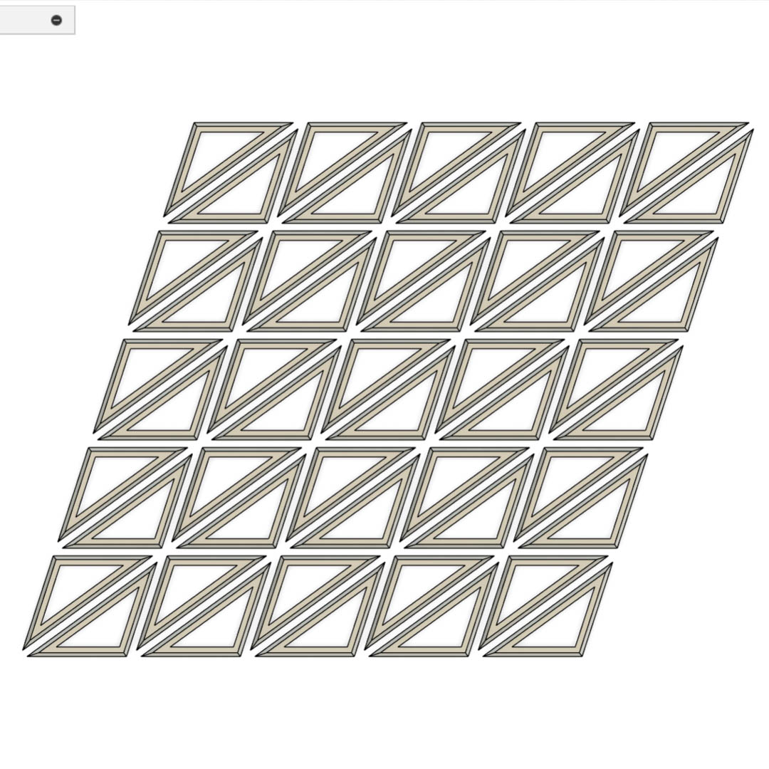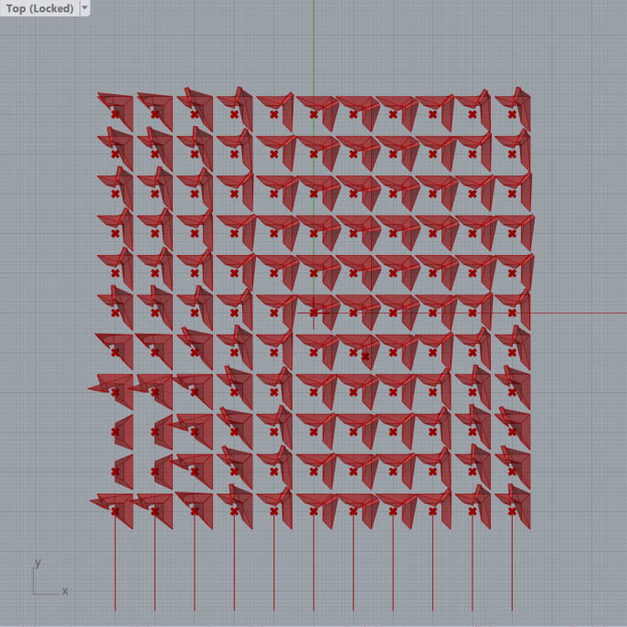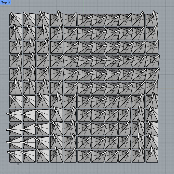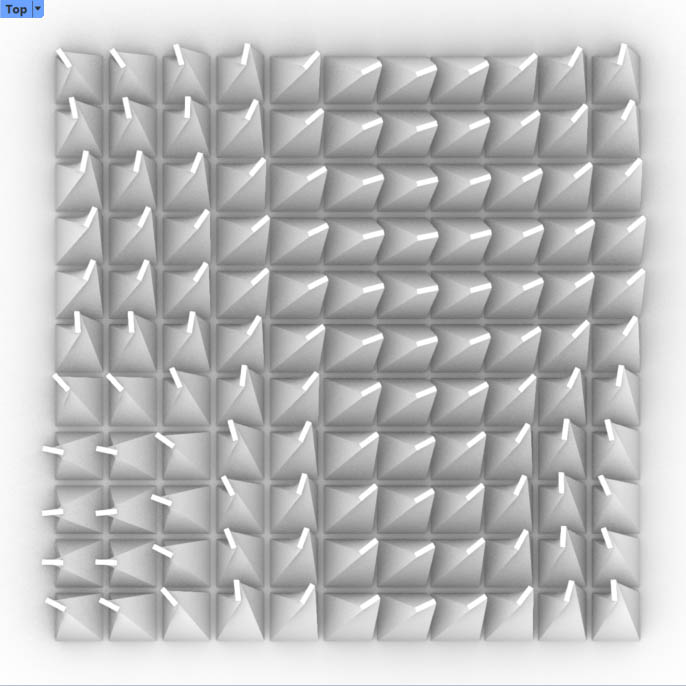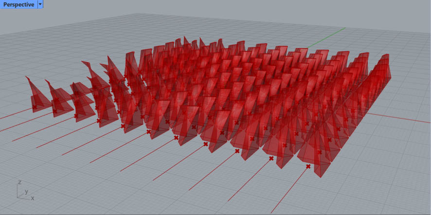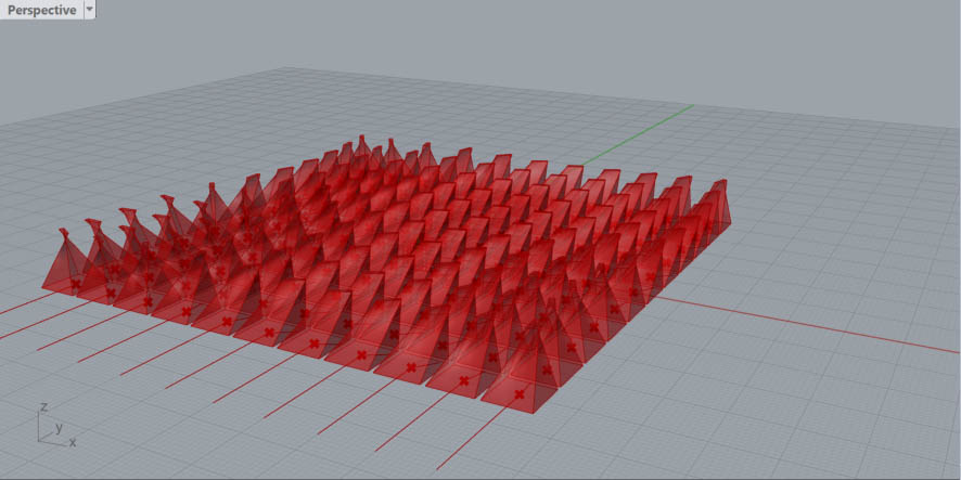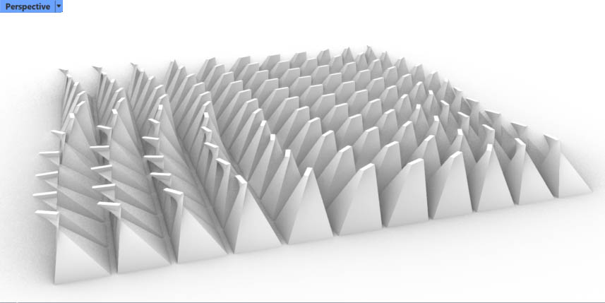 Another exploration was to create a series of triangular prisms and extrude them beyond the array of pyramids, in both x- and y- directions, and then subtracting them from the pyramids to leave hollow canopy-like structures.