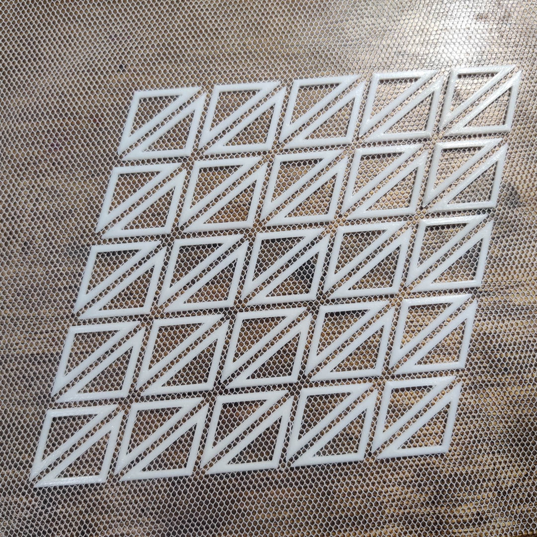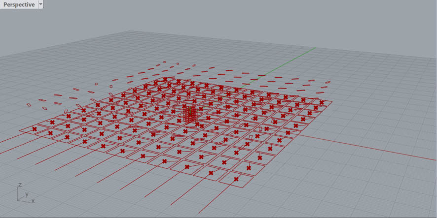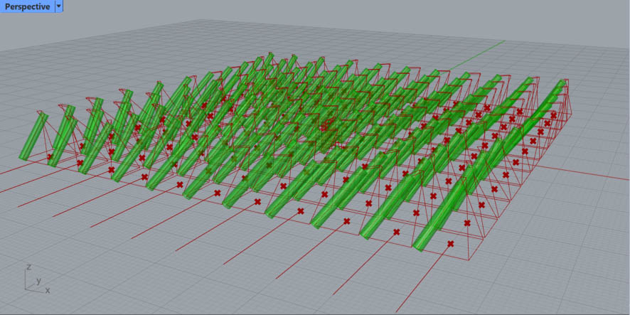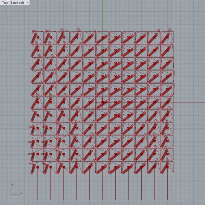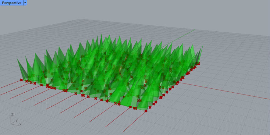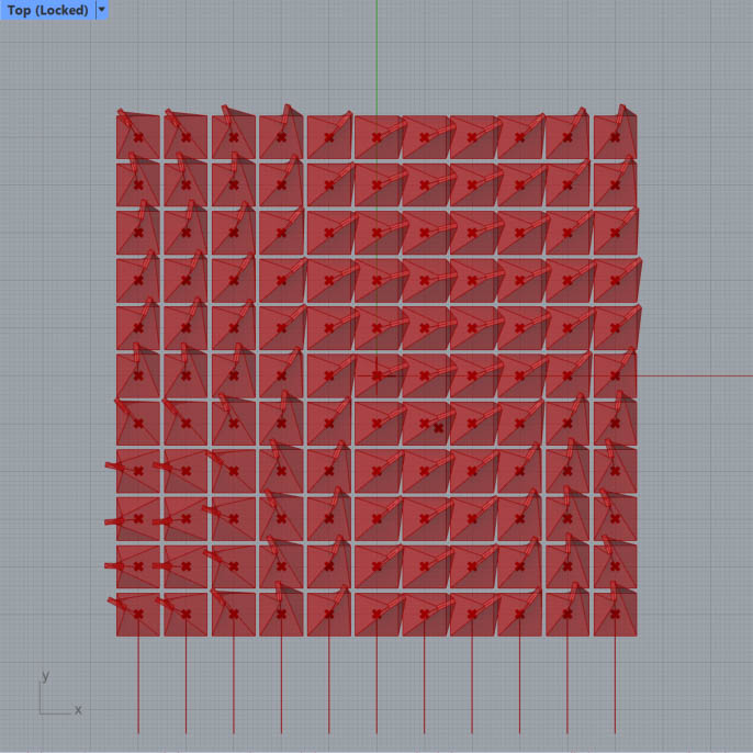 Another exploration was to create a series of triangular prisms and extrude them beyond the array of pyramids, in both x- and y- directions, and then subtracting them from the pyramids to leave hollow canopy-like structures.