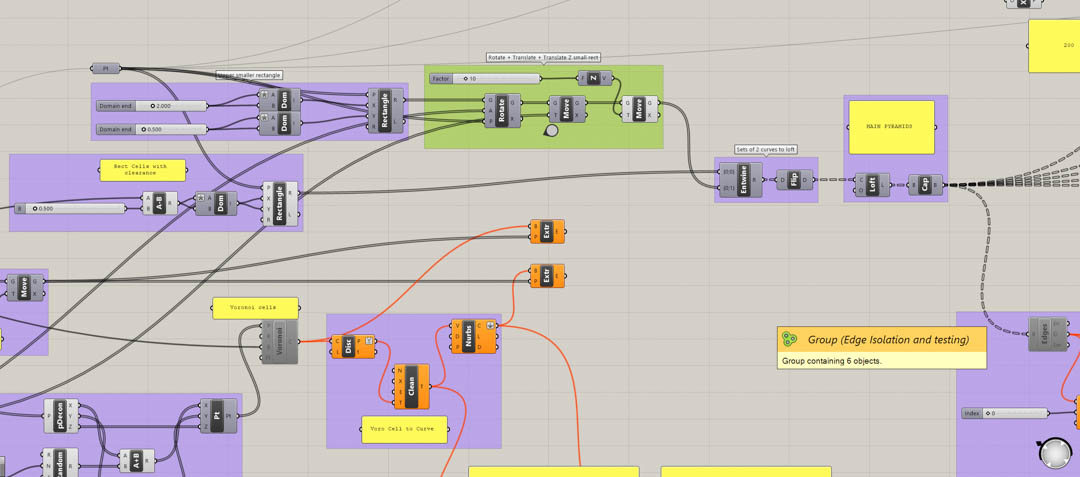 Apart from the above, I tried various additional plays on the pyramids generated, including cutting into them, using their edges or faces, etc, as well as using the same base grid for attractor-based variations and voronoi cell structures.