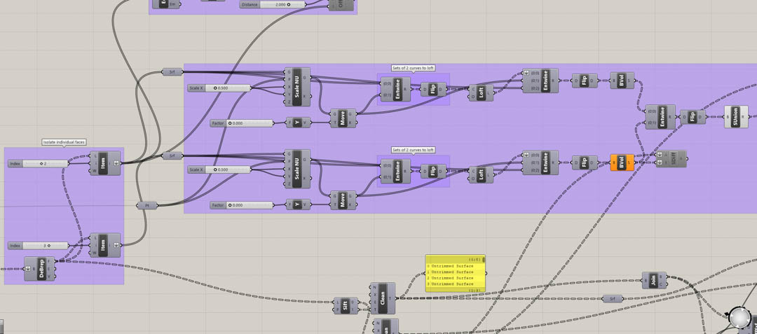 At one point, I needed to transpose the data at one order of branches, while mantaining the sequence of those branches from a higher order level. After much messing around with list tools, data tree tools, and other options, I consulted ChatGPT. It informed me that this kind of partial reordering would be very difficult and the inbuilt tools would not suffice. I also tried cross-referencing the entire tree; the results would give me the combinations I needed but being a many-to-many multiplication, they would