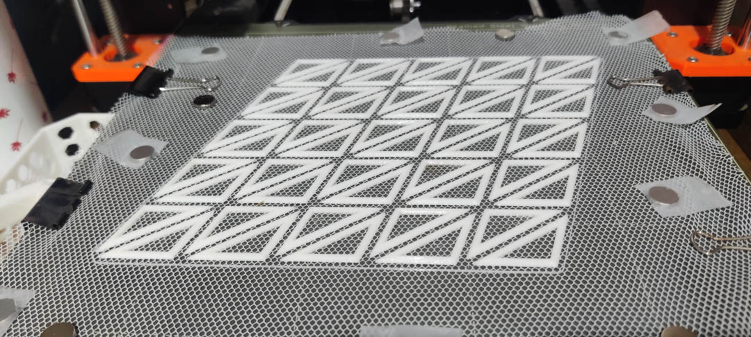 I have used the sandwich method for all the prints. It involves putting down a few layers of the print, then laying down a mesh fabric, and then continuing the print upwards.