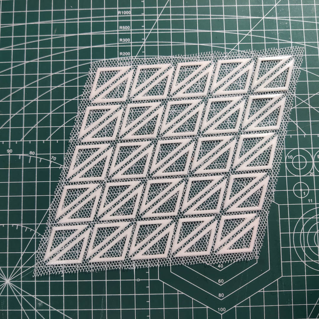 The final swatch was a good print. It was not displaying any properties that were completely unexpected, since I had played with this idea in my head for a very long time. However, the motion of the swatch when handled is decidedly fun to play with, since it is a mix of rigid cells and flexible margins, and the cells are small and numerous enough to turn it into a material property rather than individual linkages.