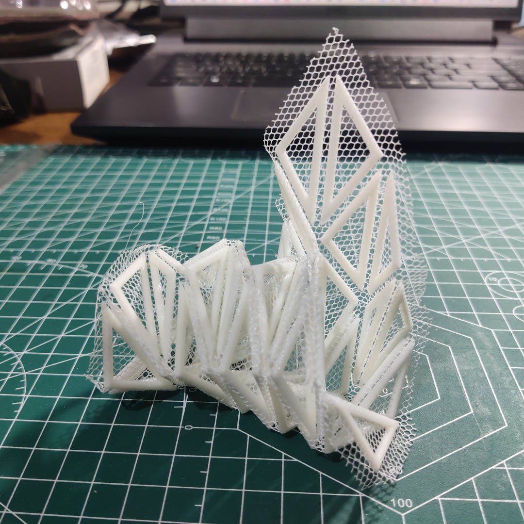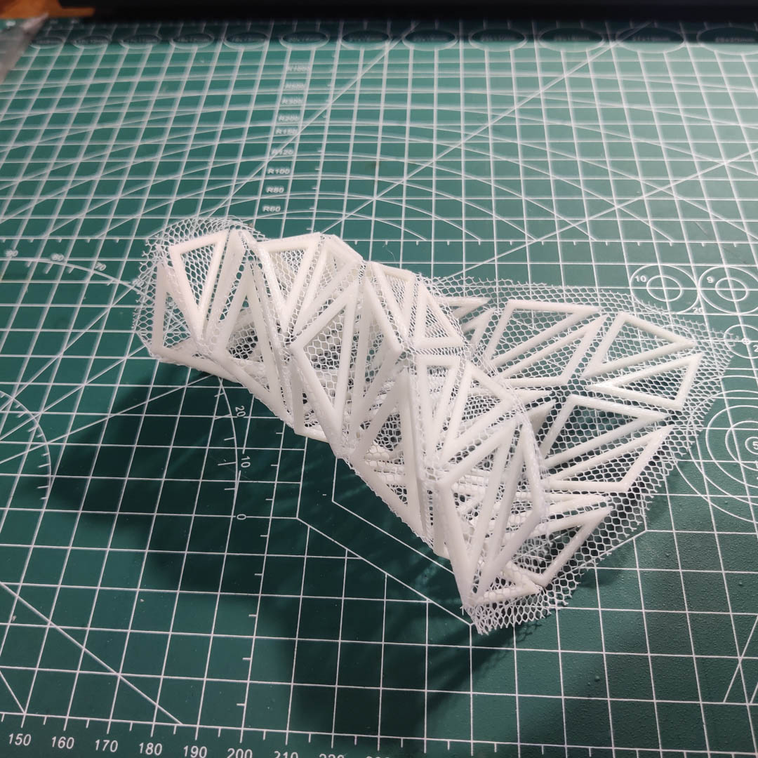 Another "problem" I've realised, adjacent to the tighter fabric margins issue, is that the fabric needs to be present in the "bending plane" which varies based on the cutting plane angles, ranging from the top surface to the bottom as the cutting planes range from -45 to 45 degrees. One possible solution is non-planar printing, that I will have to explore later, for now.