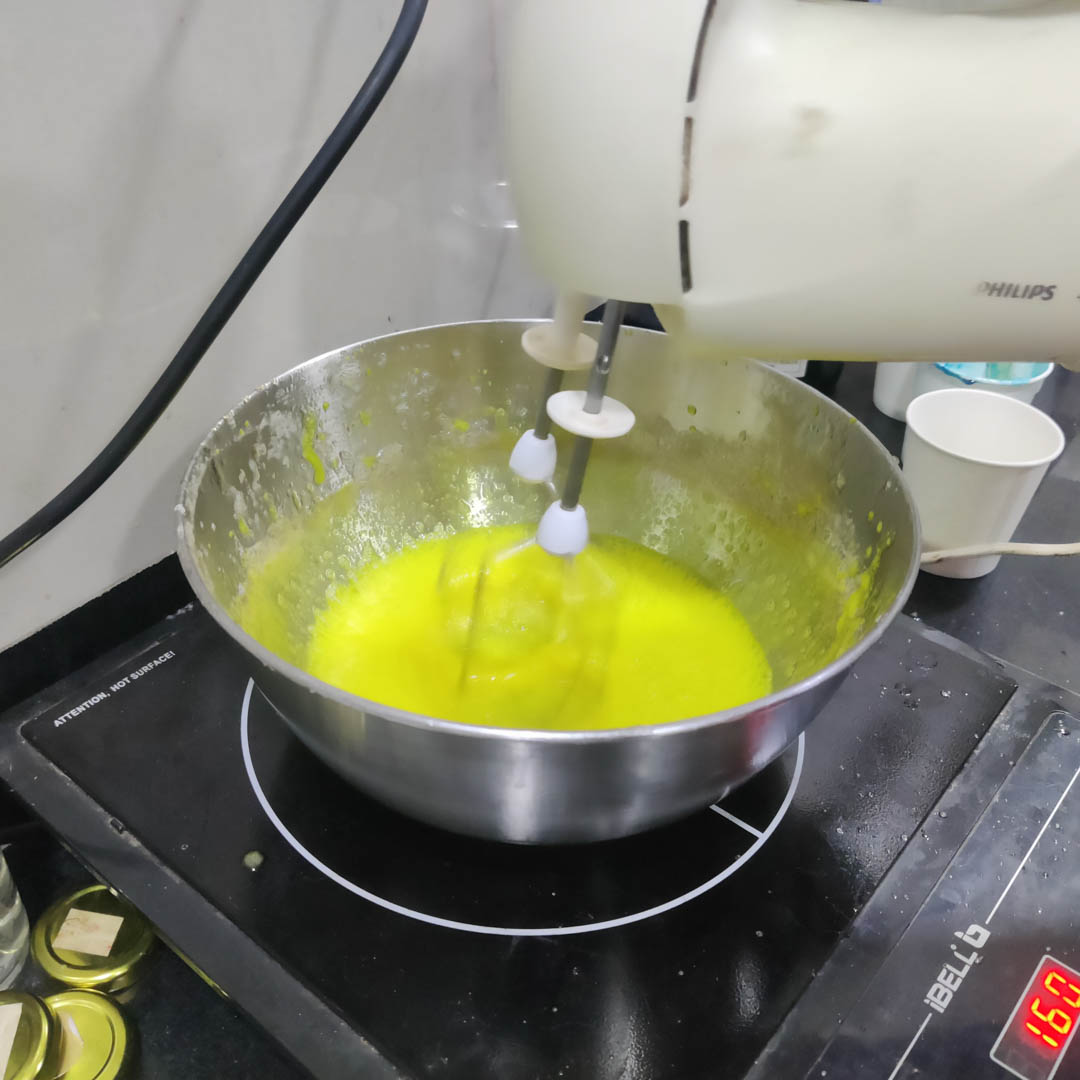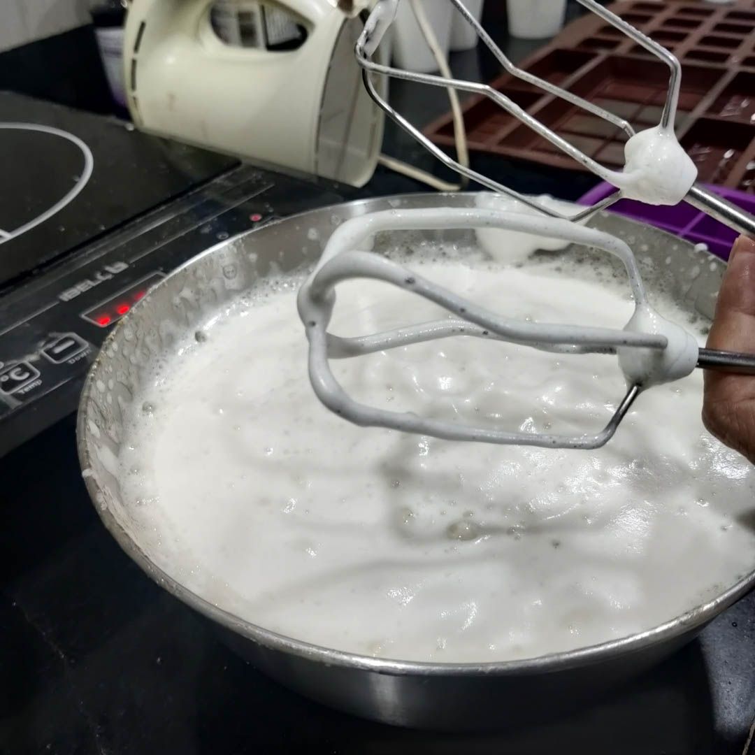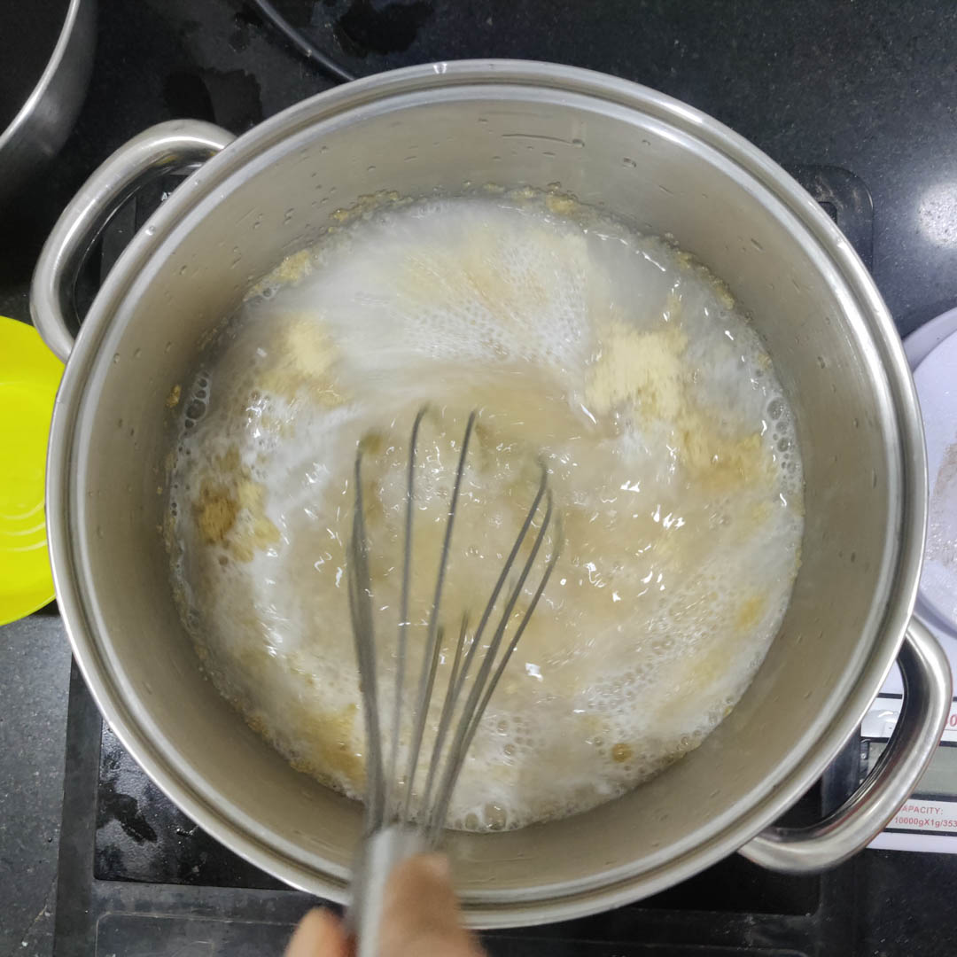 - Remove from heat, add dish soap, and whip until airy foam forms.