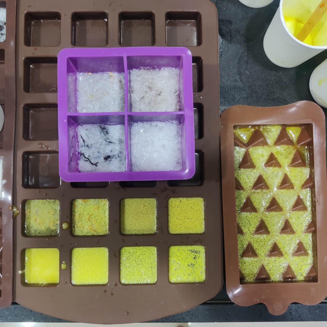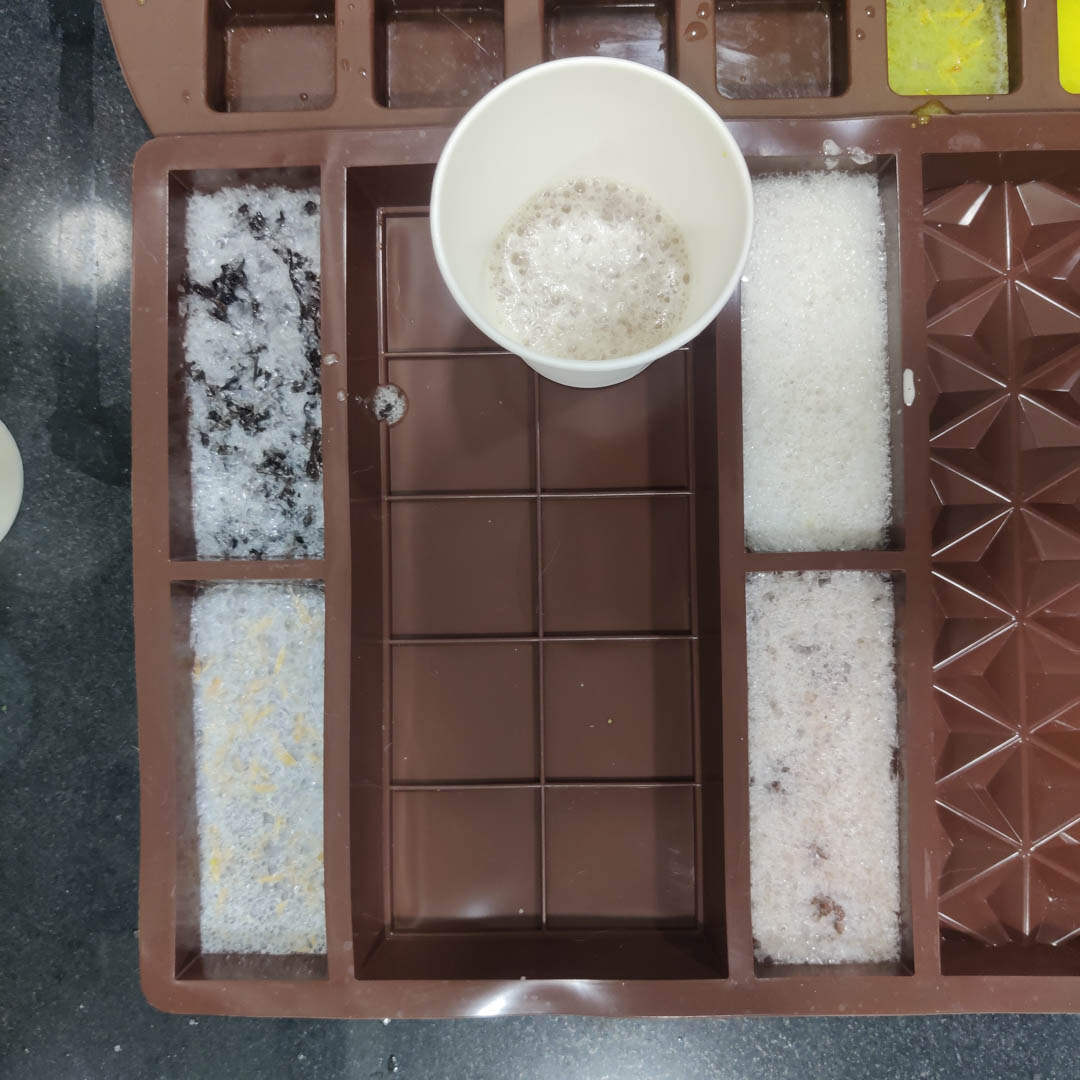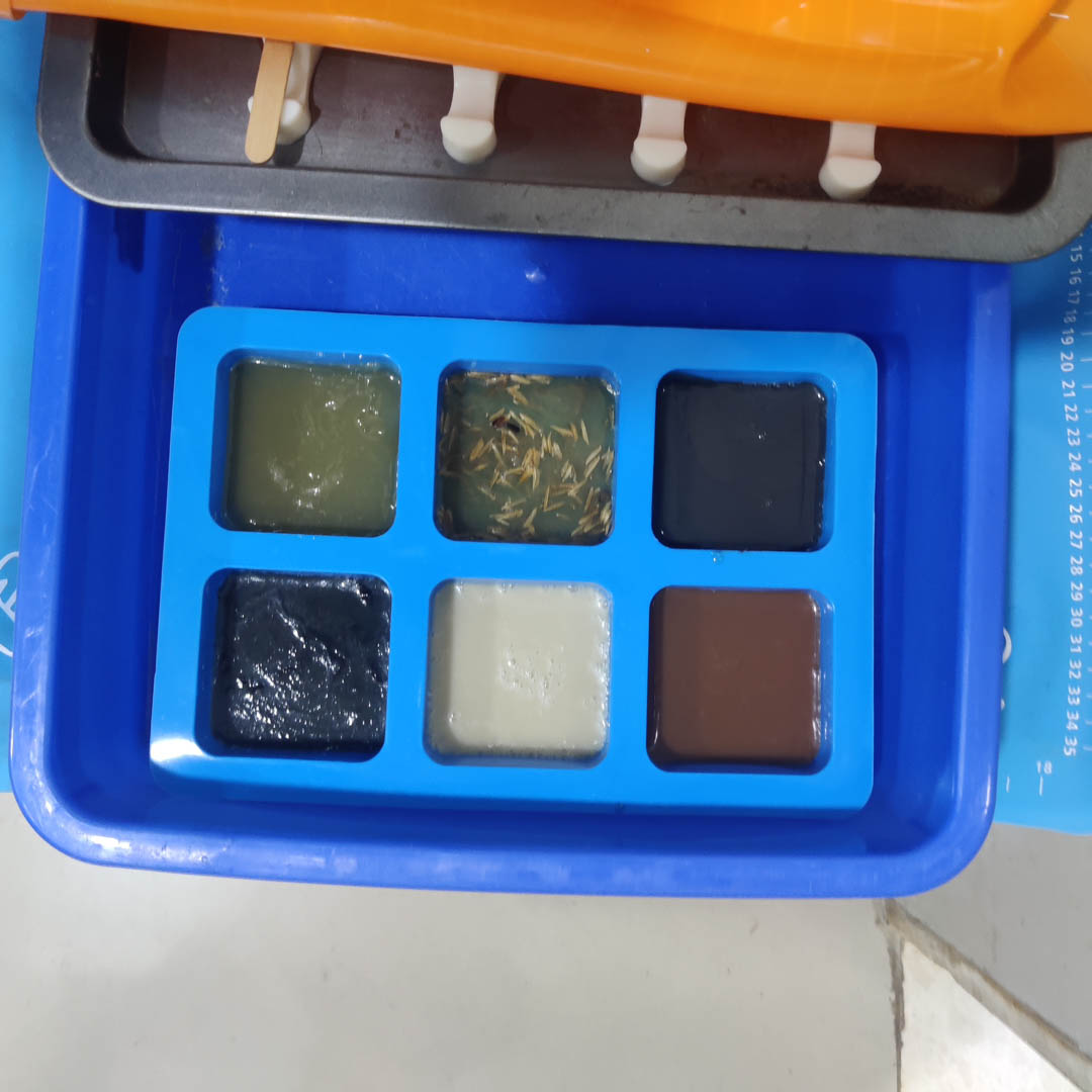 - Poured the natural colour samples into the molds, leavimg enough to make coloured versions