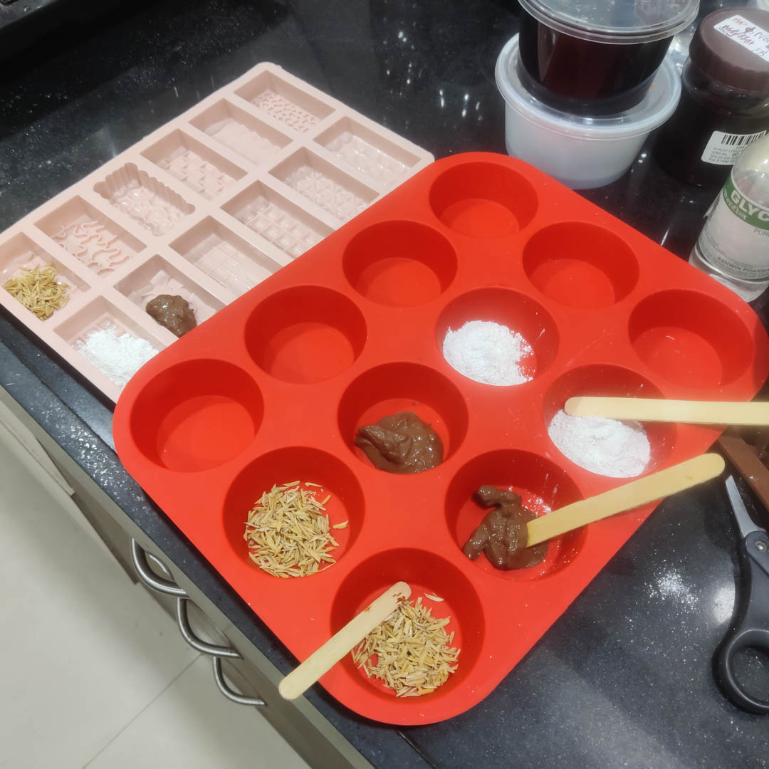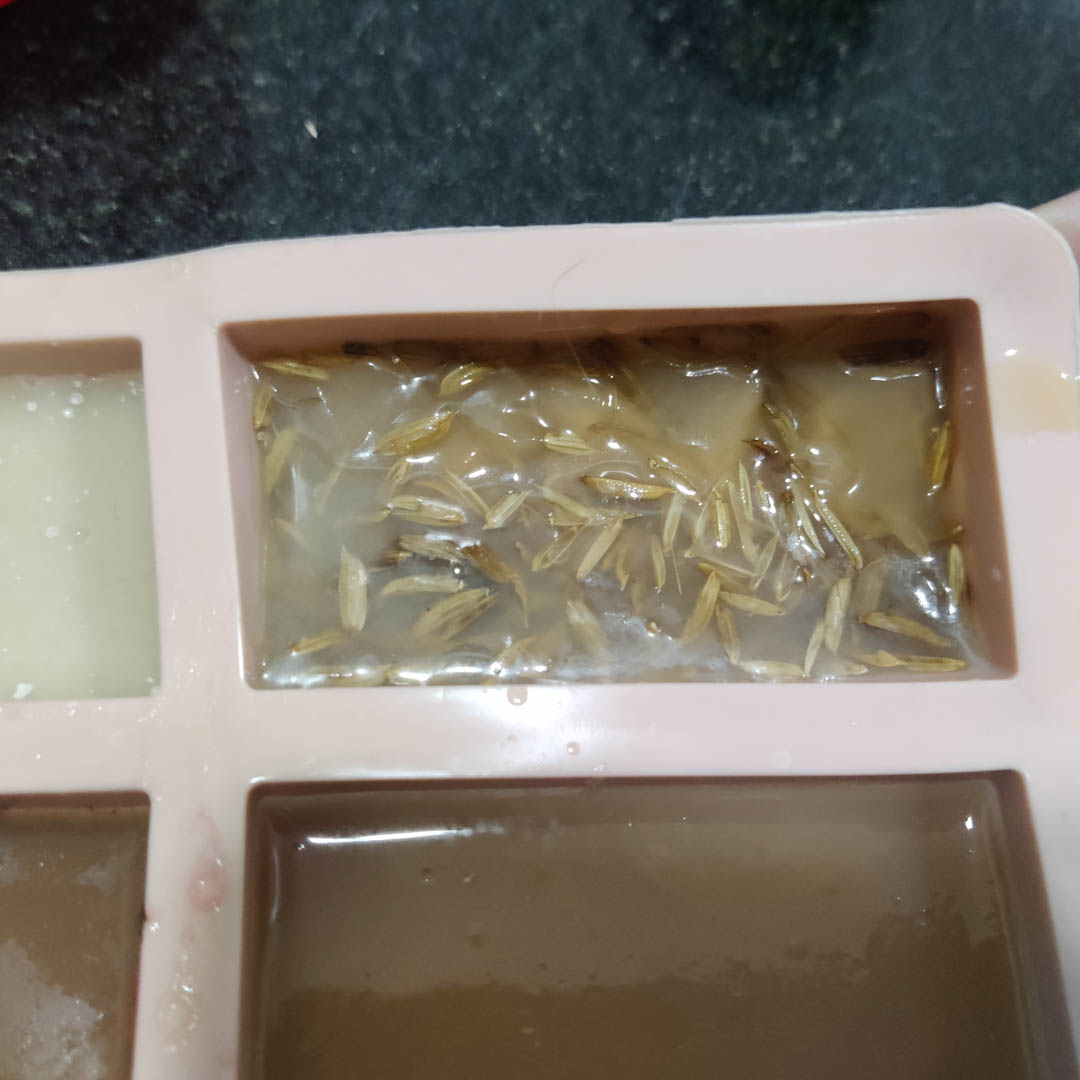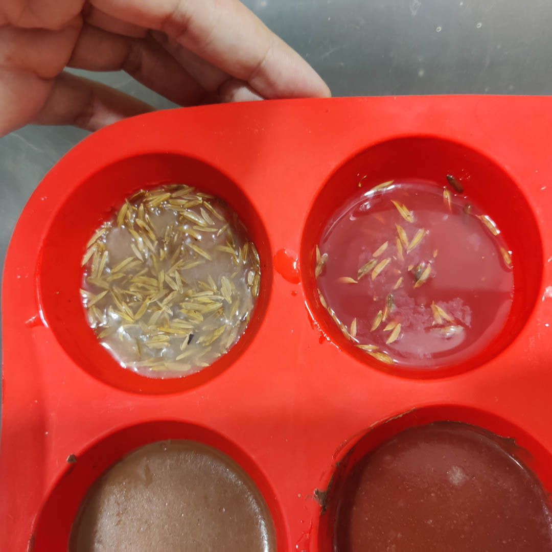 - Poured the natural colour samples into the molds, leavimg enough to make coloured versions