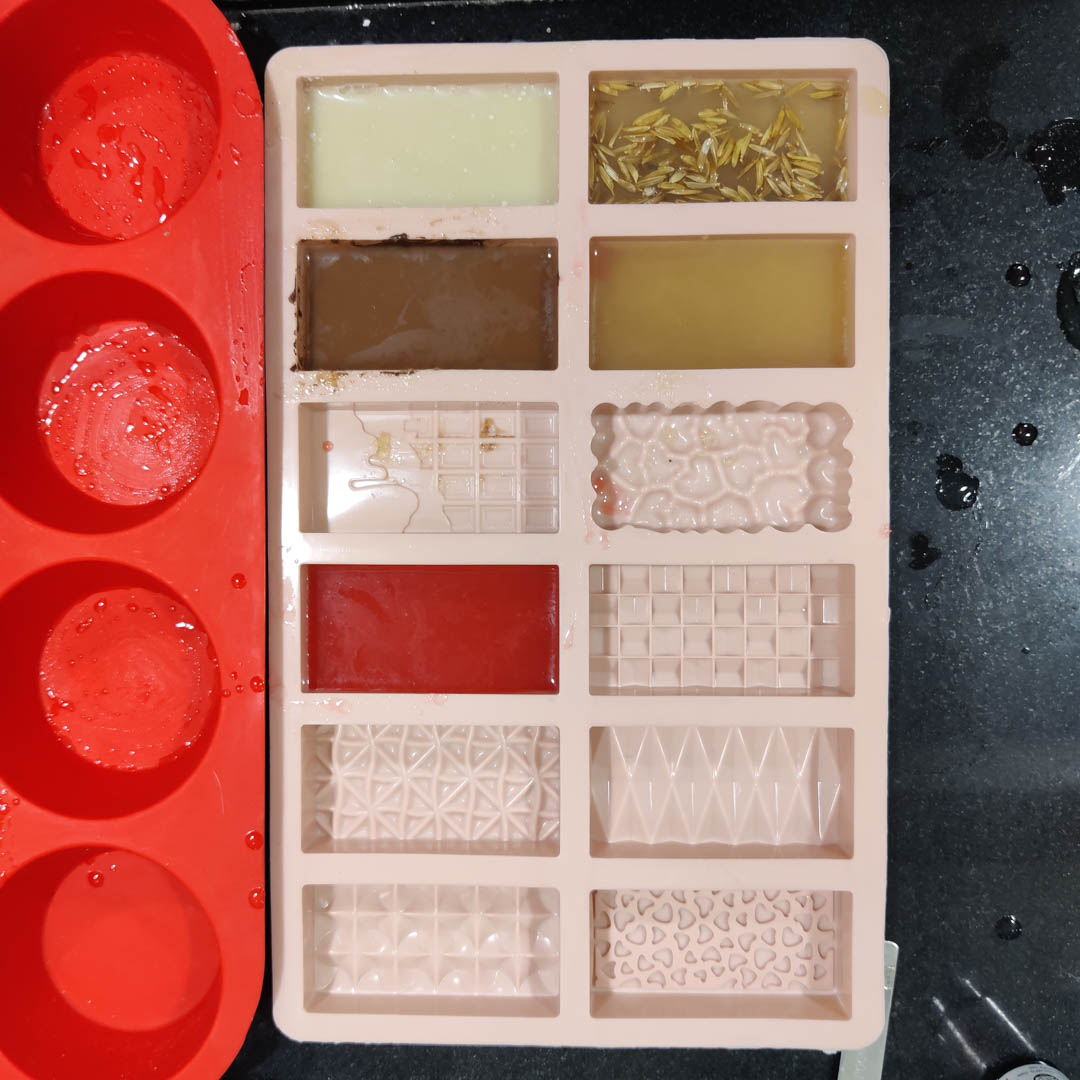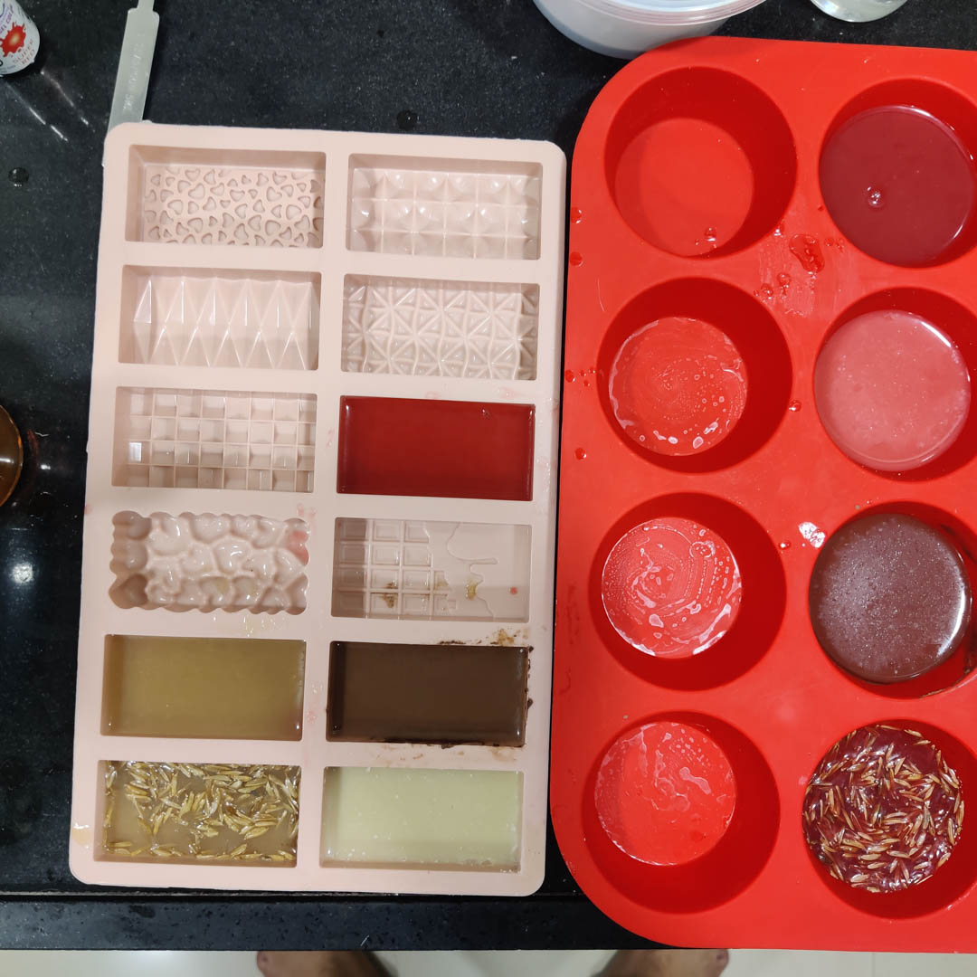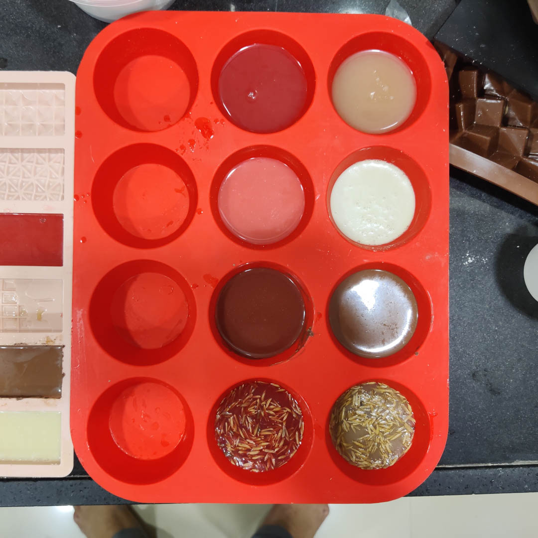 For the remaining leftover material, added a drop of food colouring and poured it into various other molds, voluminous as well as flat