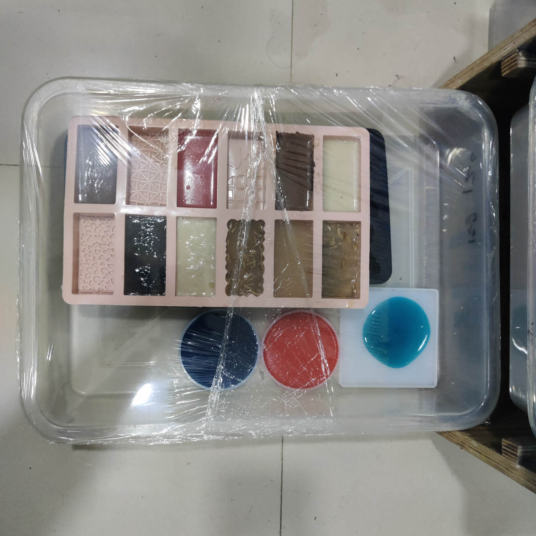 → Heat water to 75–80 °C. → Add glycerine, then gelatine gradually; stir 20–25 min until syrupy. → Pour into molds; alternate pressing overnight / air-drying by day. |