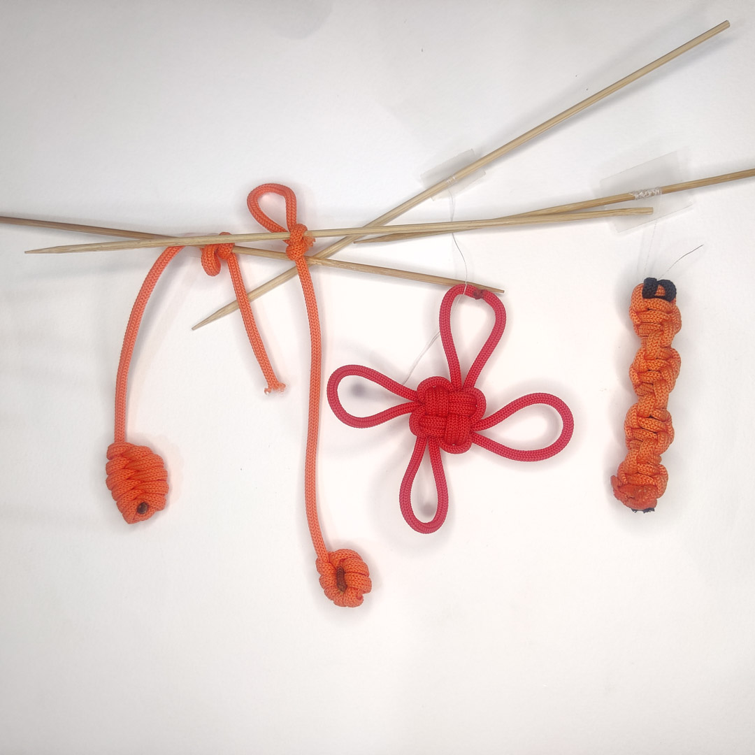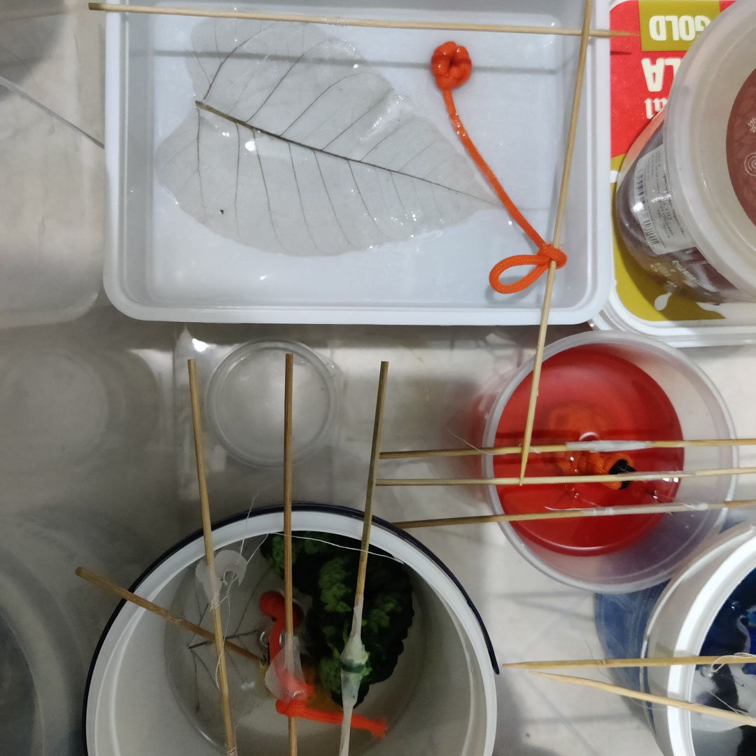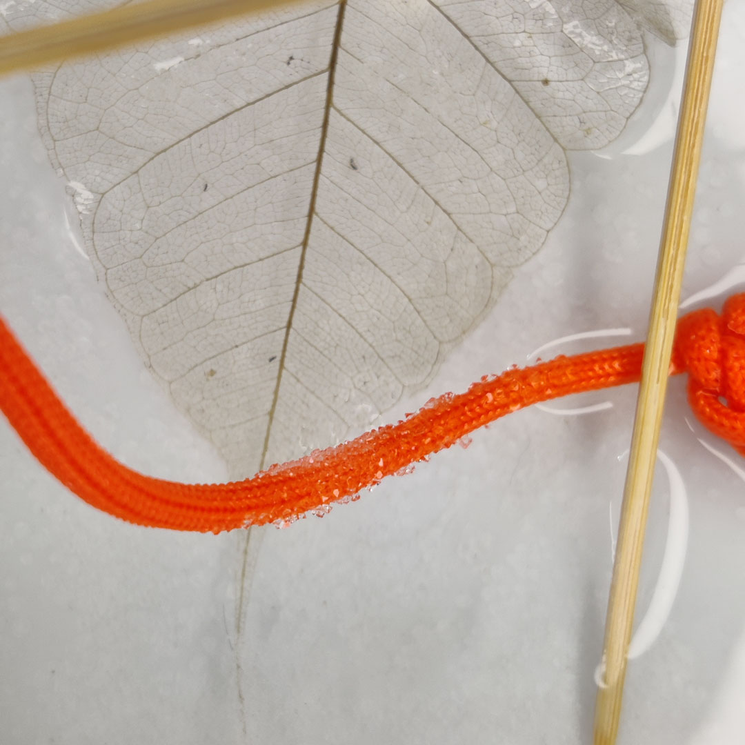- Image 6 : A scrap of fabric wrapped around 3 pieces of skewers to create a 3d surface for the crystals to deposit on