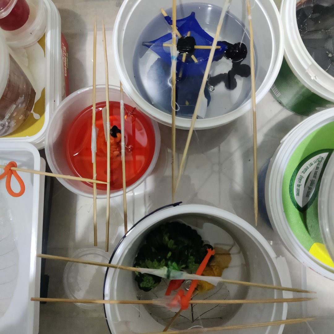 - Tie threads to suspend the objects over the vessel. I used individual skewers so they could be rotated, winding the thread until the object hung at the right height, then taping the thread in place