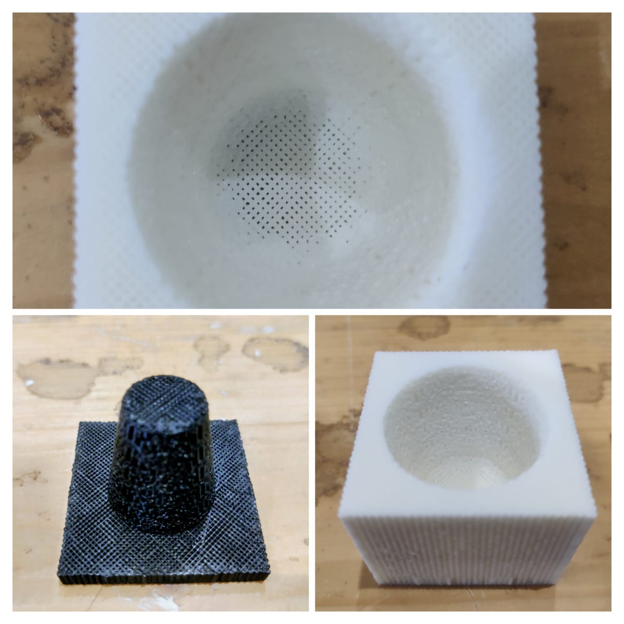 Composite molding using 3d prints. Printing the mold without a perimeter shell, only infill, to explore how well the infill structure wicks the moisture away or absorbs it, and if it can then successfully be used for water based composite molding, like paper, papiermache , shredded cardboard , etc.