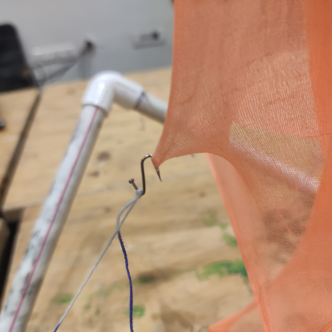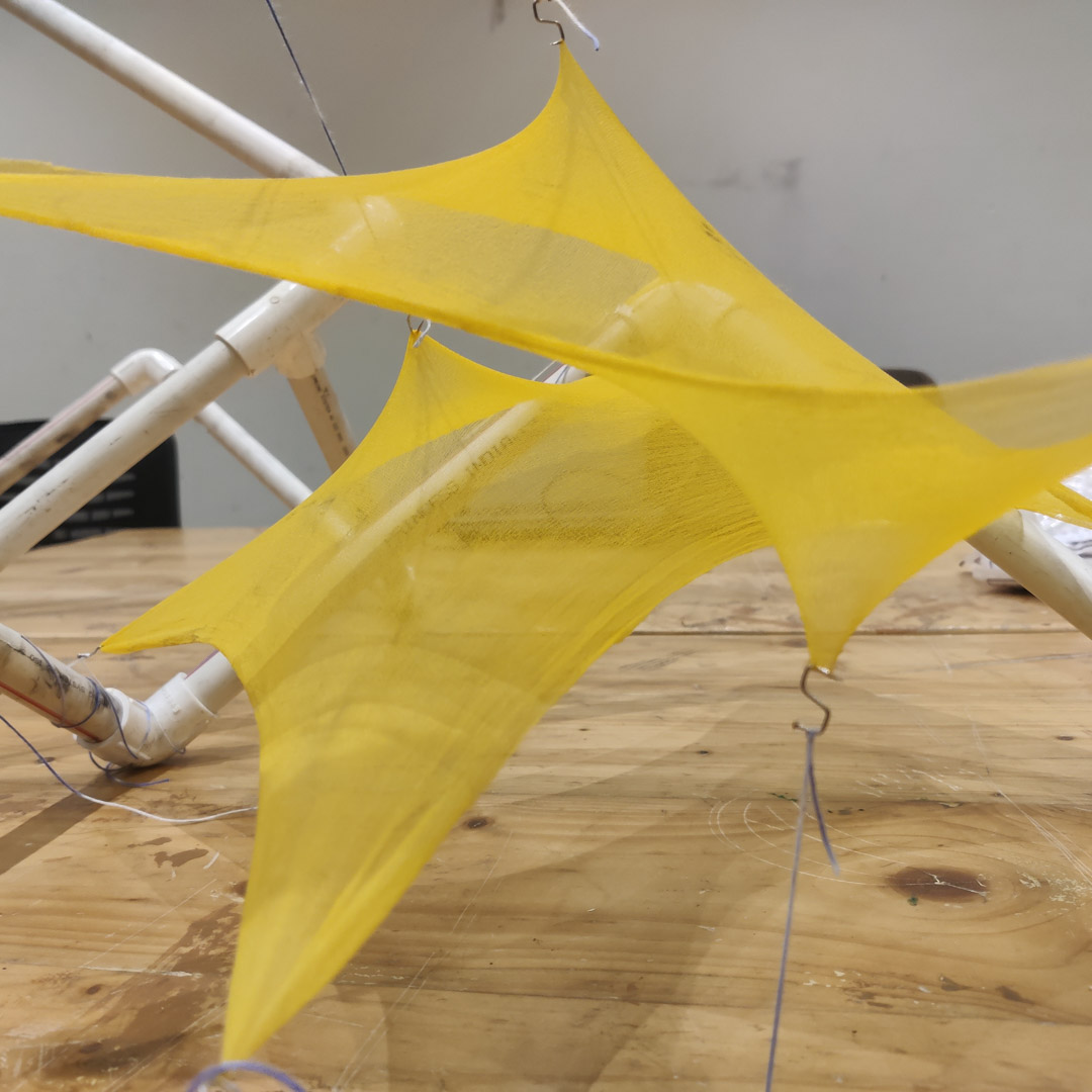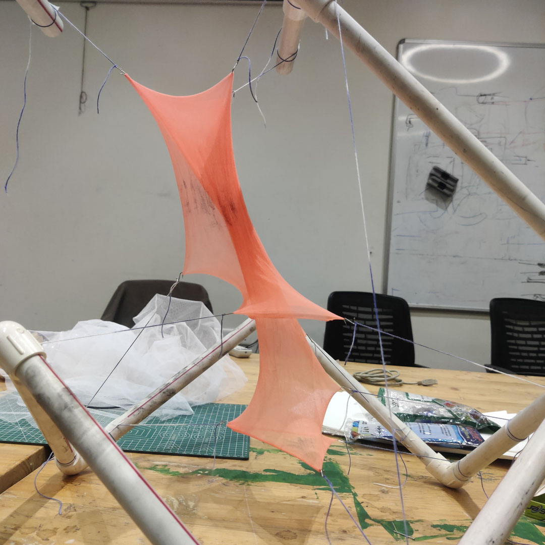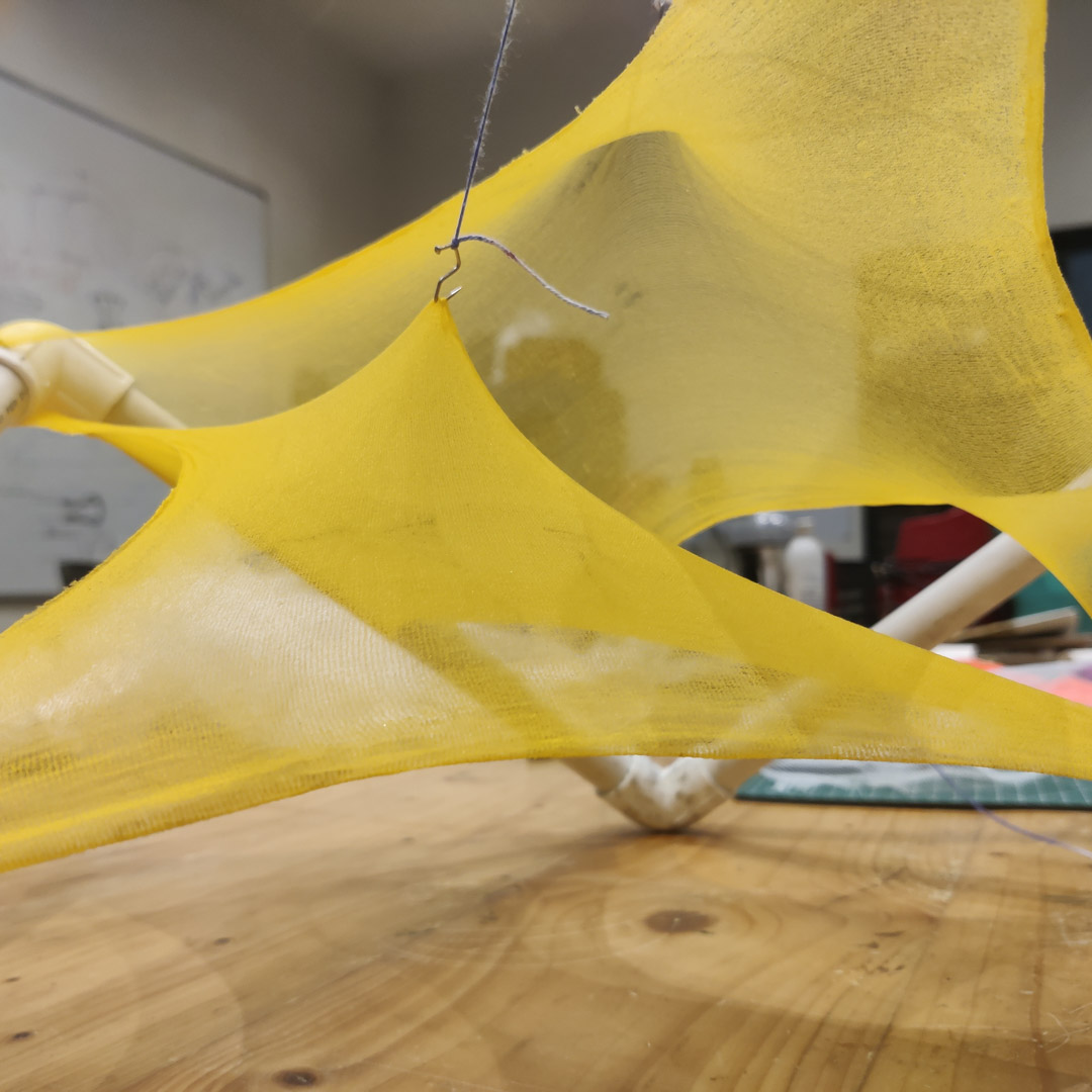I conduct a class exercise for my students where we use pipe frames and stocking fabric to create tensile forms by pulling at the fabric using hooks and threads.