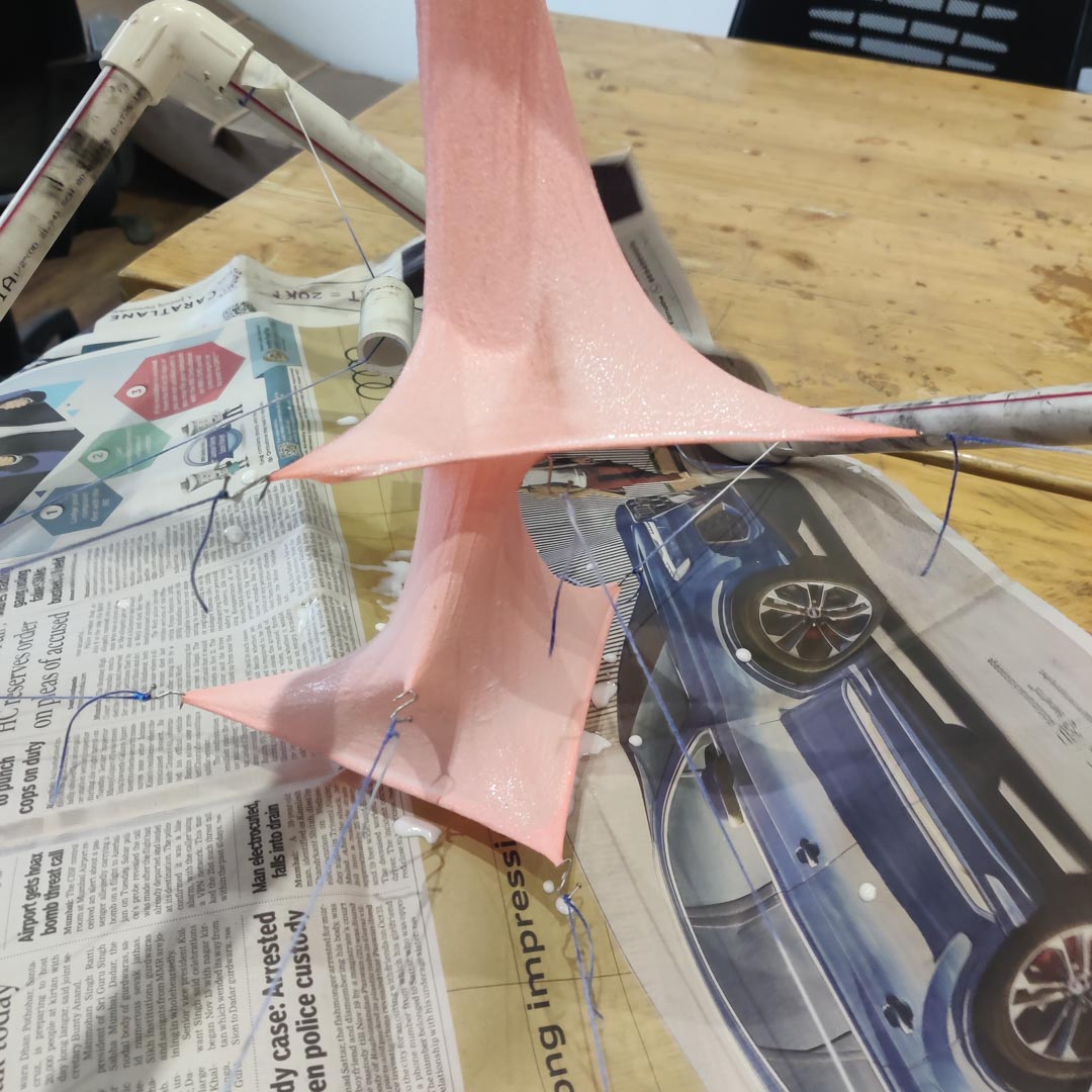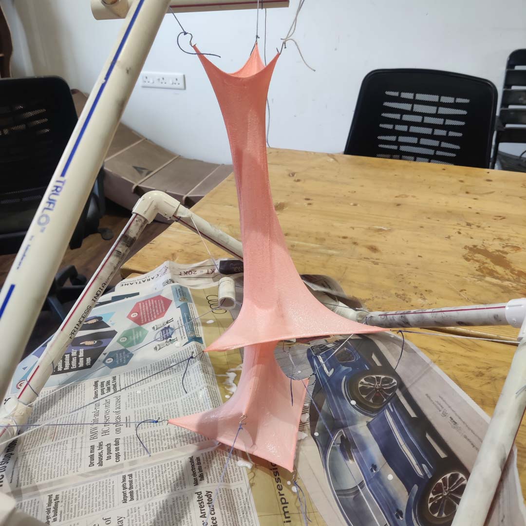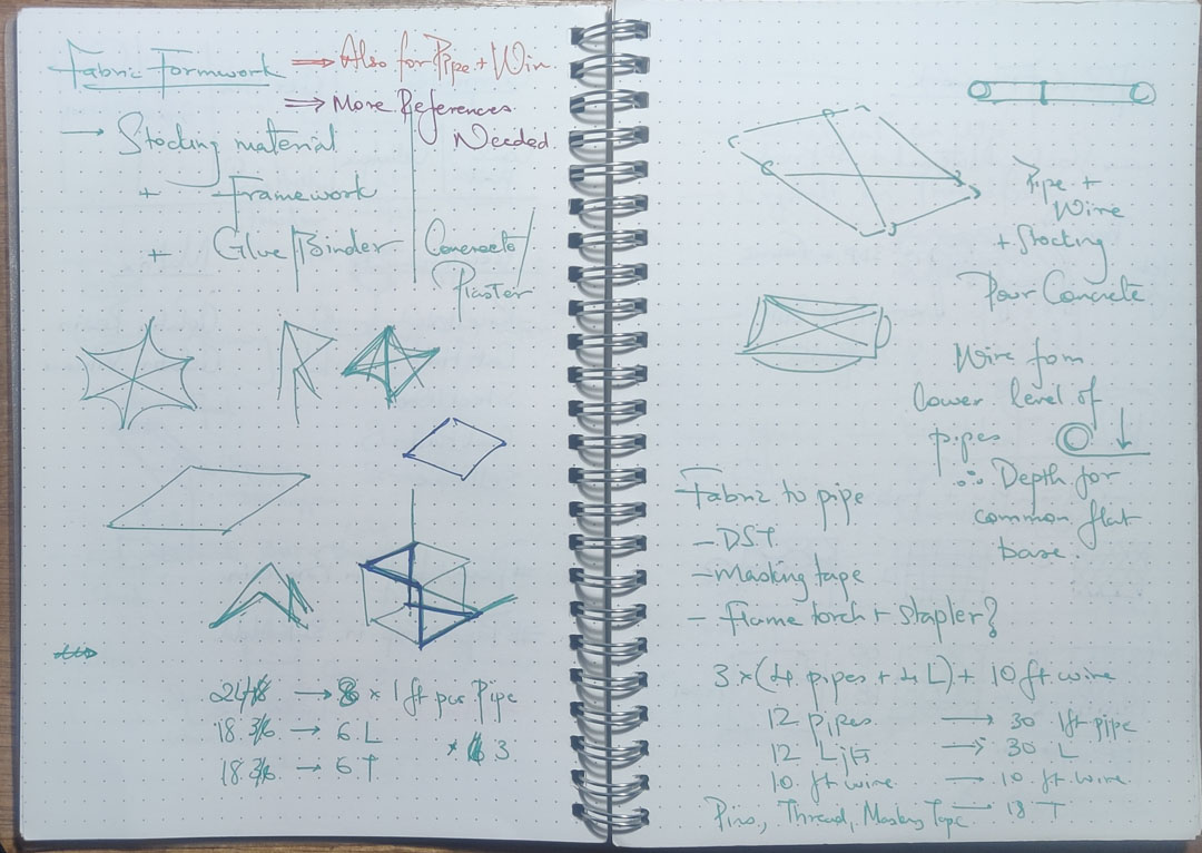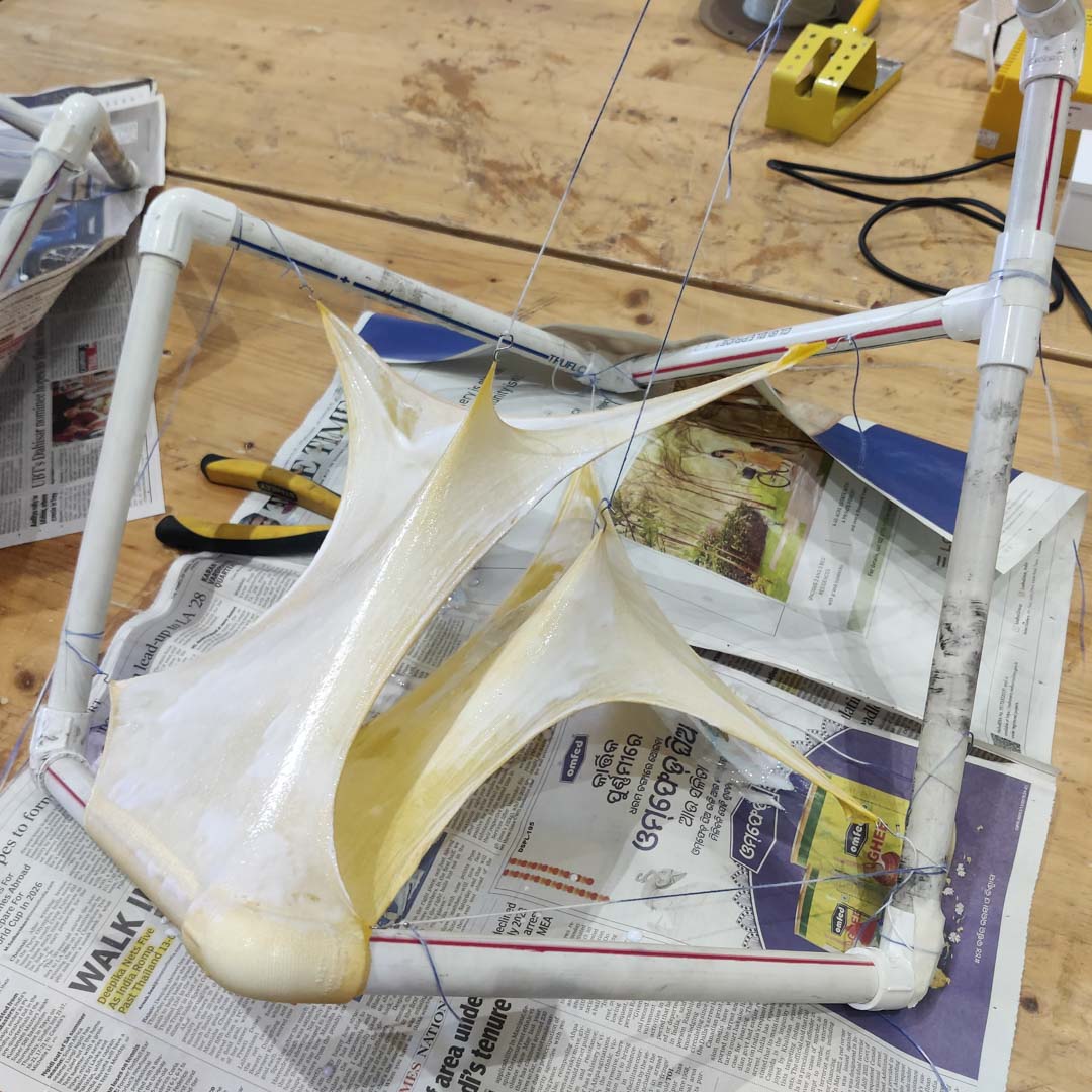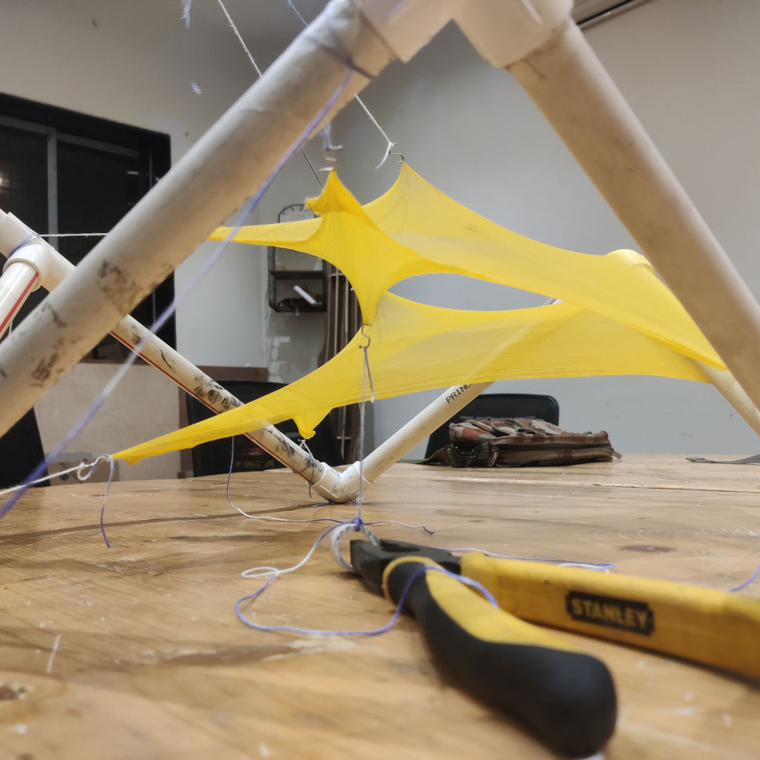 Given the inspiration from the session, I also want to cast a heavier material - PoP or concrete - in the tensile form created by the scaffolding. This won't work on a 3D frame, but a 2D frame with a combination of fabric, threads and wires would work. The frame could be pipes in a rectangle, or more complex shapes created by 3D printing a frame onto the stretchy fabric.