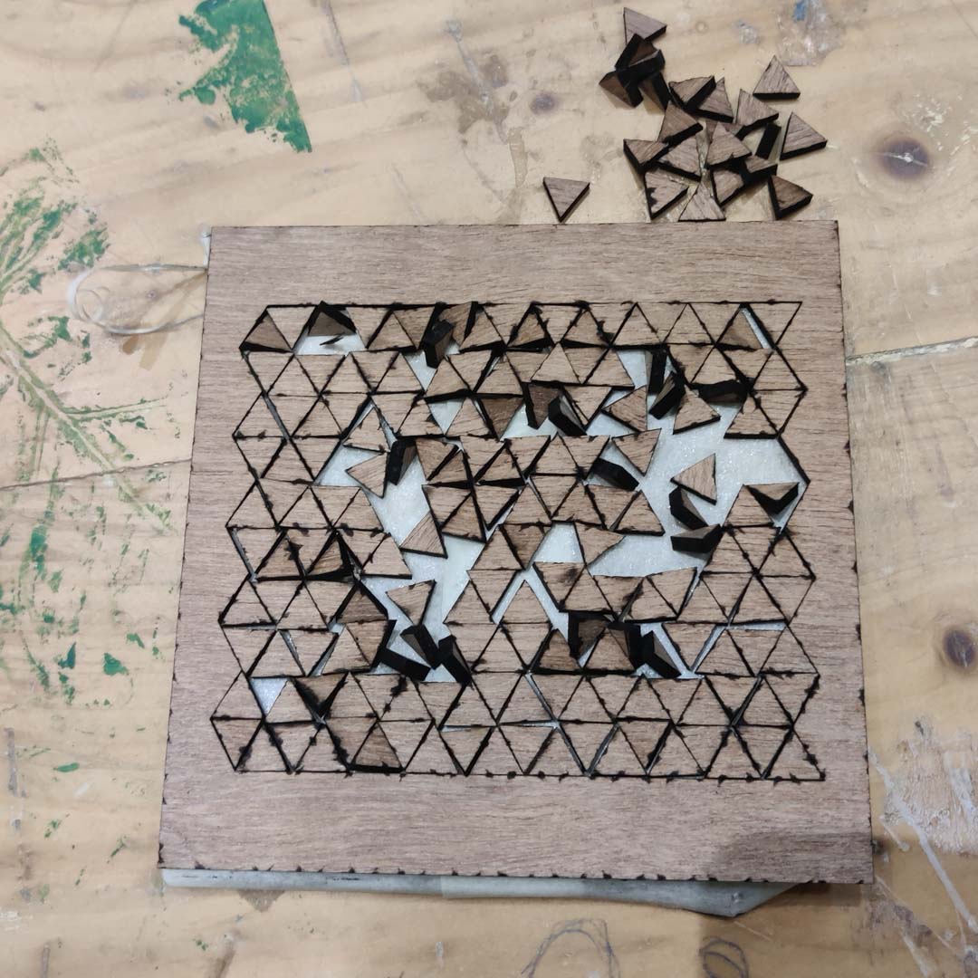 - The tape method worked so well for trials that I did not bother gluing layers of fabric to the wooden mosaic unless I wanted to take a particular swatch further