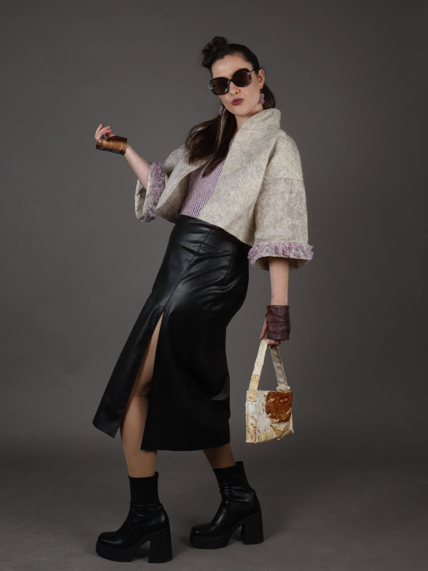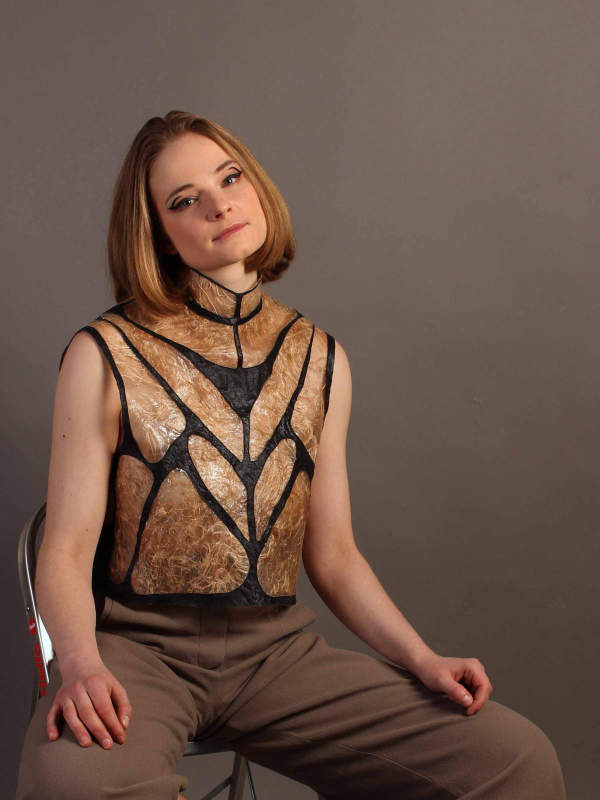 Over the past three years, my artistic practice has increasingly focused on experimental biomaterials such as kombucha leather, mycelium, and alginate, as well as natural dyeing, 3D printing, and laser cutting. Within my project Costume of the Future, I created costume pieces from alginate, gelatin, kombucha leather, and mushroom mycelium, alongside a 3D-printed garment. The project serves as a proof of concept for ecological design methods, demonstrating the development of sustainable materials and their practical applications in costume design.