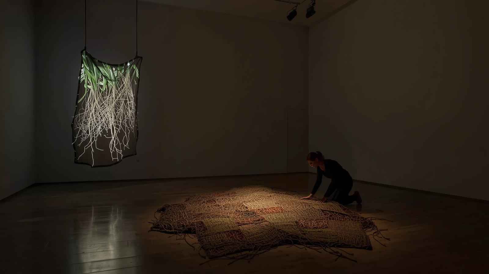The work combines organic materials and sensor technology to create a dynamic system that reacts to presence and touch: