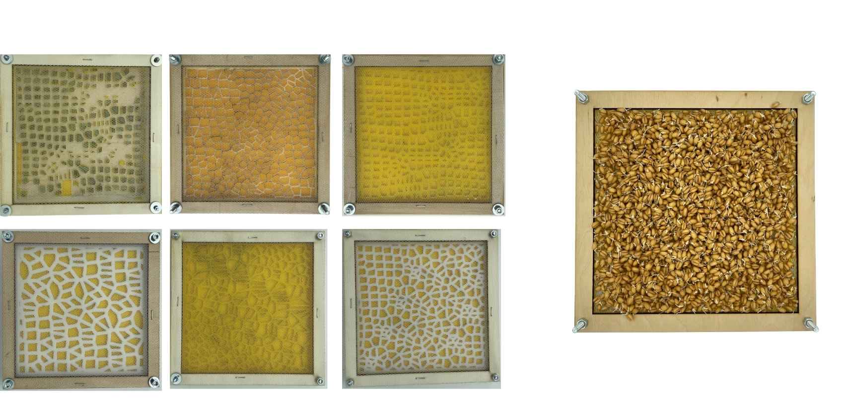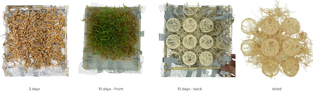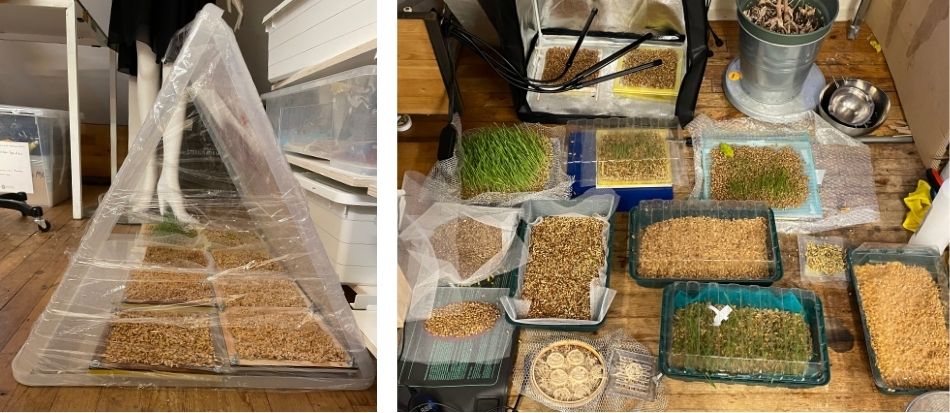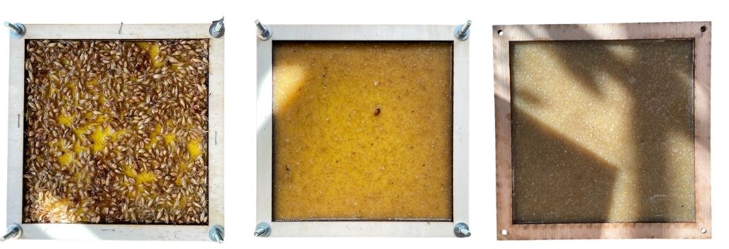 To keep the process circular and waste-free, I autoclaved the leftover seeds after harvesting and combined them with wheat starch to create a biomaterial. The result became very sticky, and due to time constraints I wasn’t able to continue developing it further. However, it shows promising potential as a way to repurpose leftover seeds. The harvested grass itself was passed on to my colleague Amber, who used it to make paper.