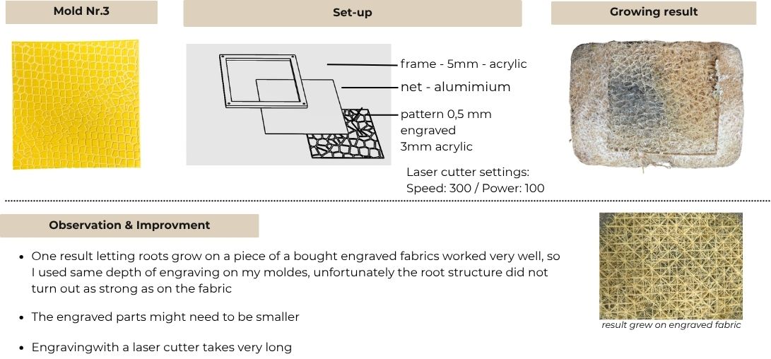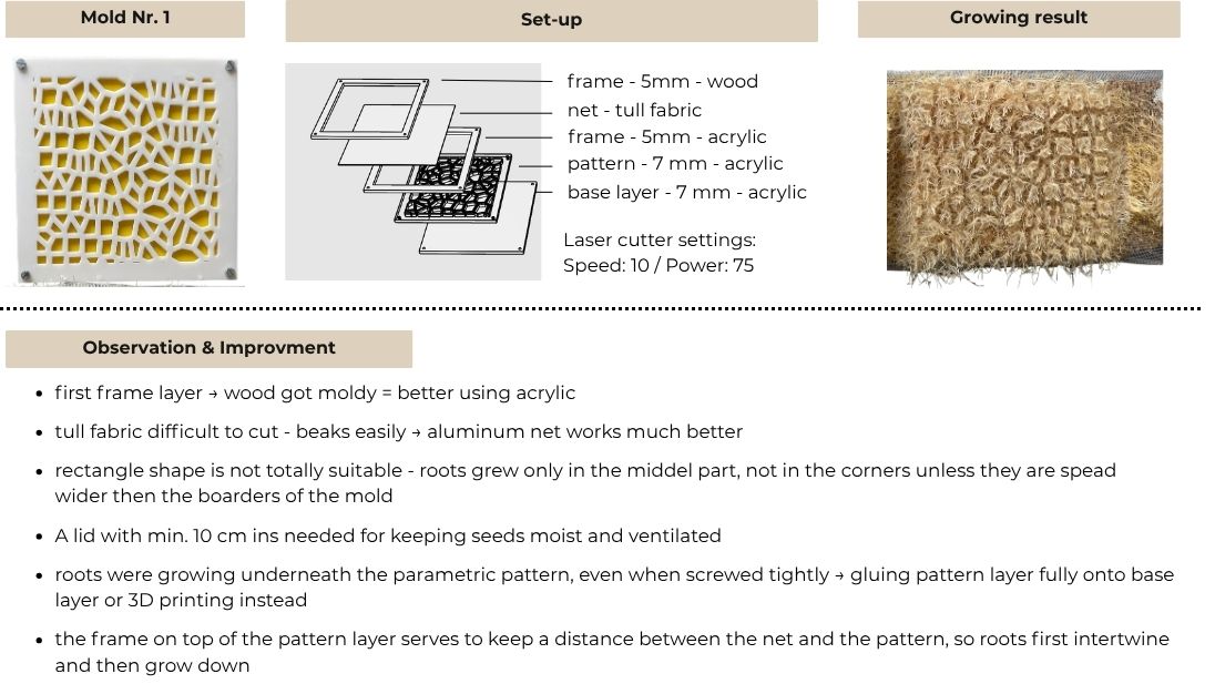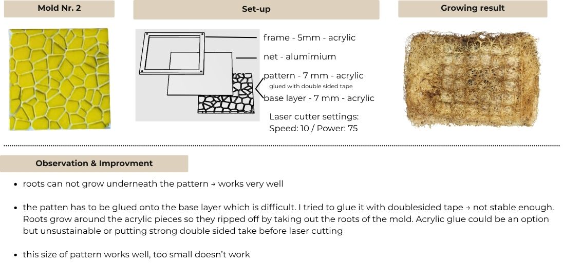 Here you can see the first test of moldes. I would recommend to laser cut the double sided tape before laser cutting, so it is way easier to fixate the parts. The solution using sand to make the tape non-sticky didn't work out as the roots grew through the sand and got stuck onto the glue.