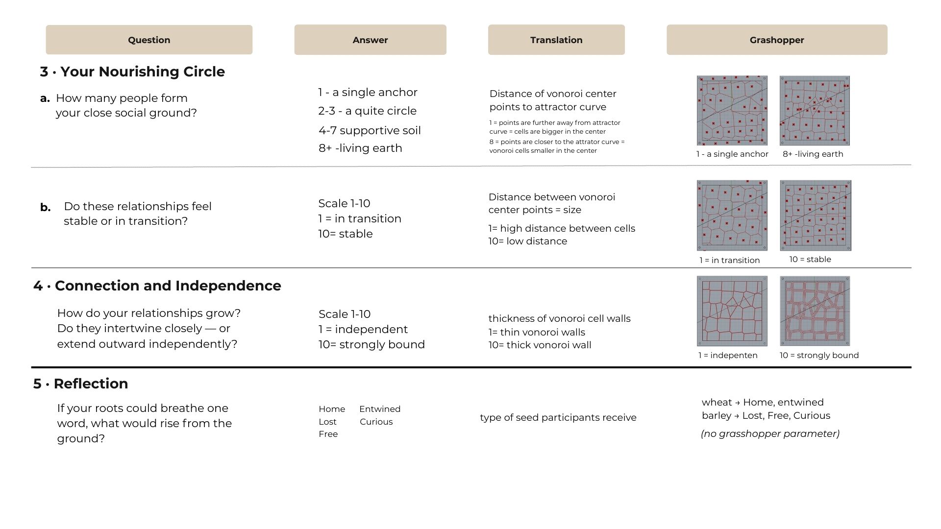 First, I needed to determine which parameters from my questionnaire should correspond to specific aspects of the design in Rhino.