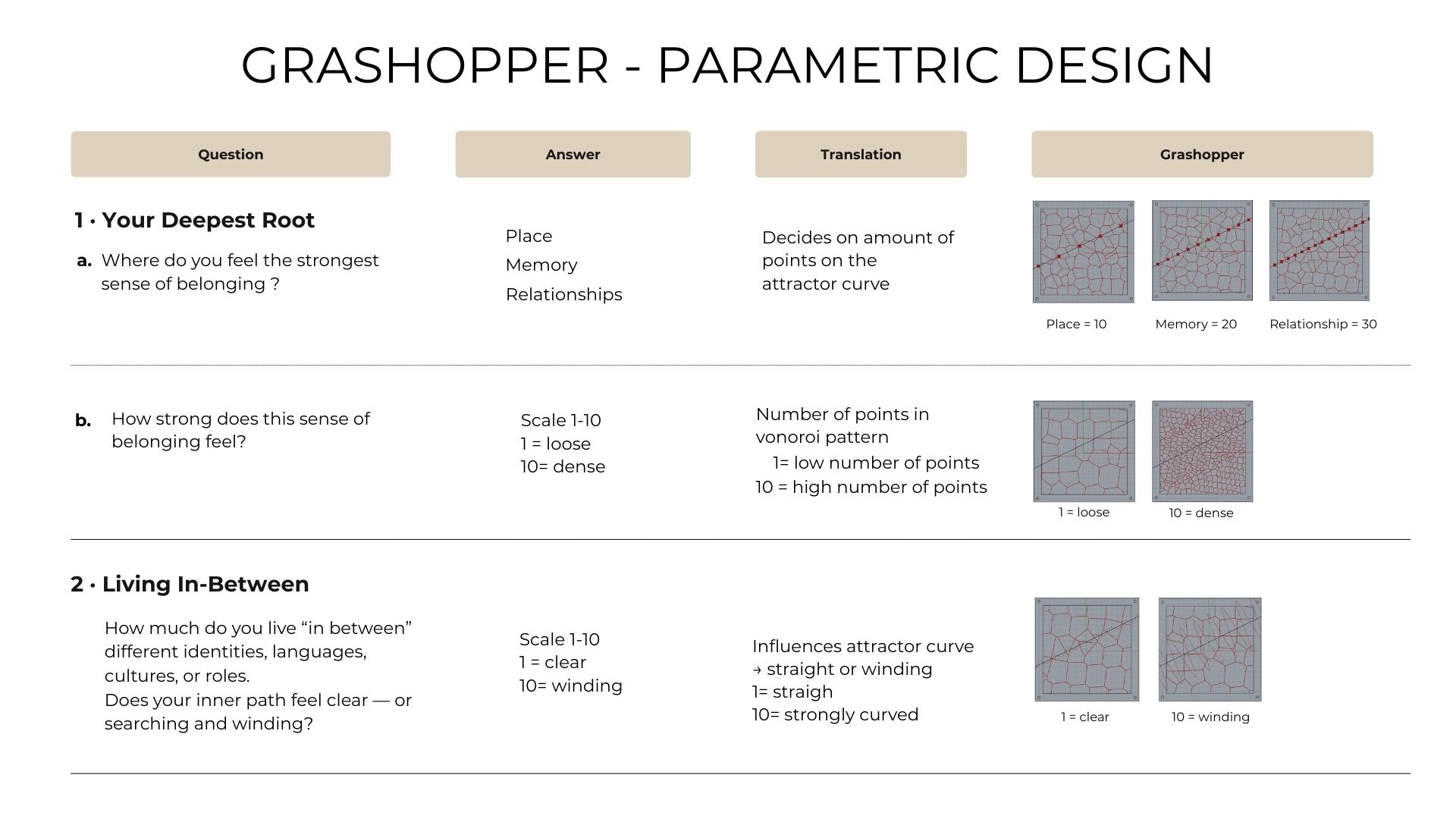 Remapping A crucial step in the process was remapping the parameter values. It wasn’t practical to simply use slider values ranging from 1 to 10, as defined in the questionnaire, because many of the design parameters required different numerical ranges. Therefore, I had to translate or “remap” the values so that they worked correctly within the design logic.