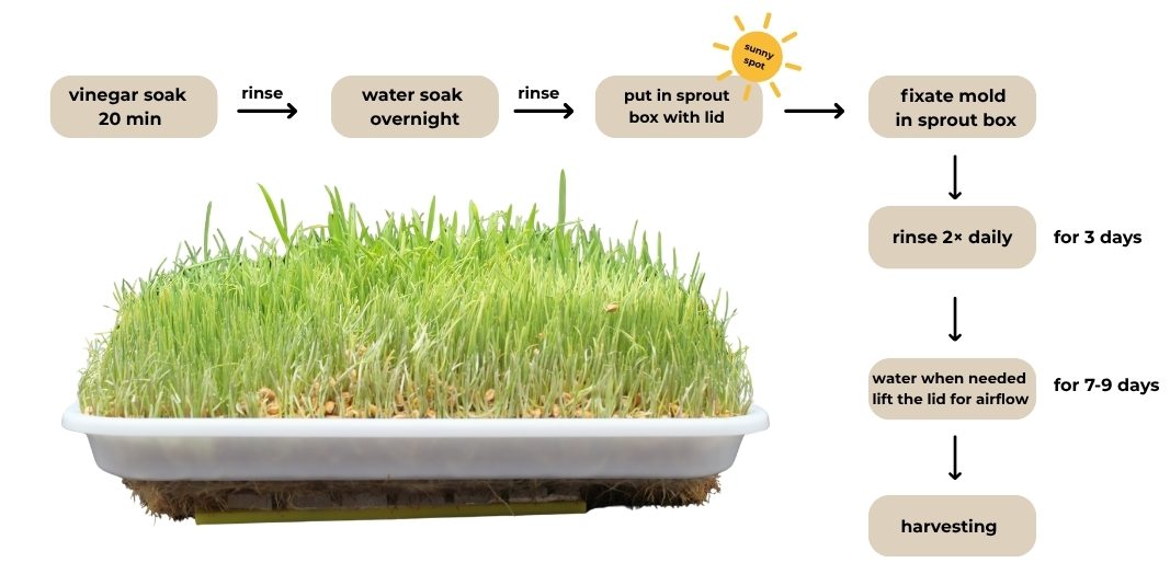 The seeds need to be soaked in vinegar for 20 minutes, then rinsed and soaked again in water for about 8 hours or overnight. After that, place them in a sprouting container with a transparent lid. This worked best for me because it kept the seeds moist (solving my main issue of dryness) while allowing airflow thanks to the 10 cm gap between the seeds and the lid. Using cling film didn’t work as well—it encouraged mold.