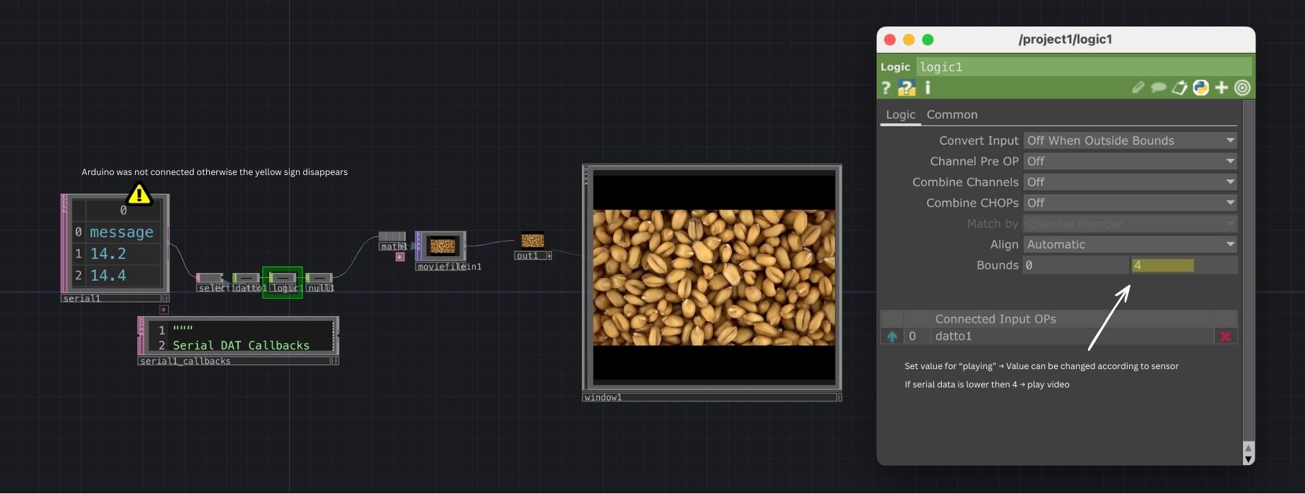 - logic1: Applies logic conditions - play video if value lower than 4, else stop