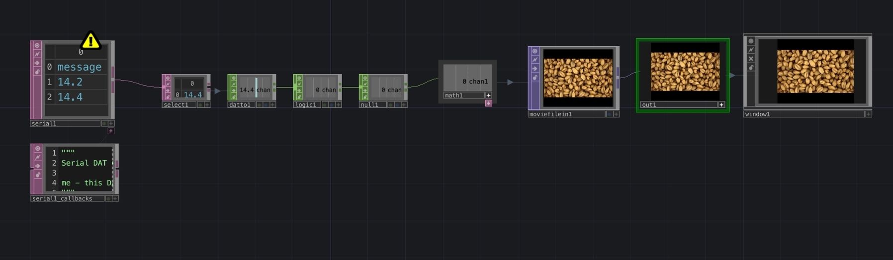 textserial1 → select1 → datto1 → logic1 → null1 → math1 → moviefilein1 → out1 -> window1