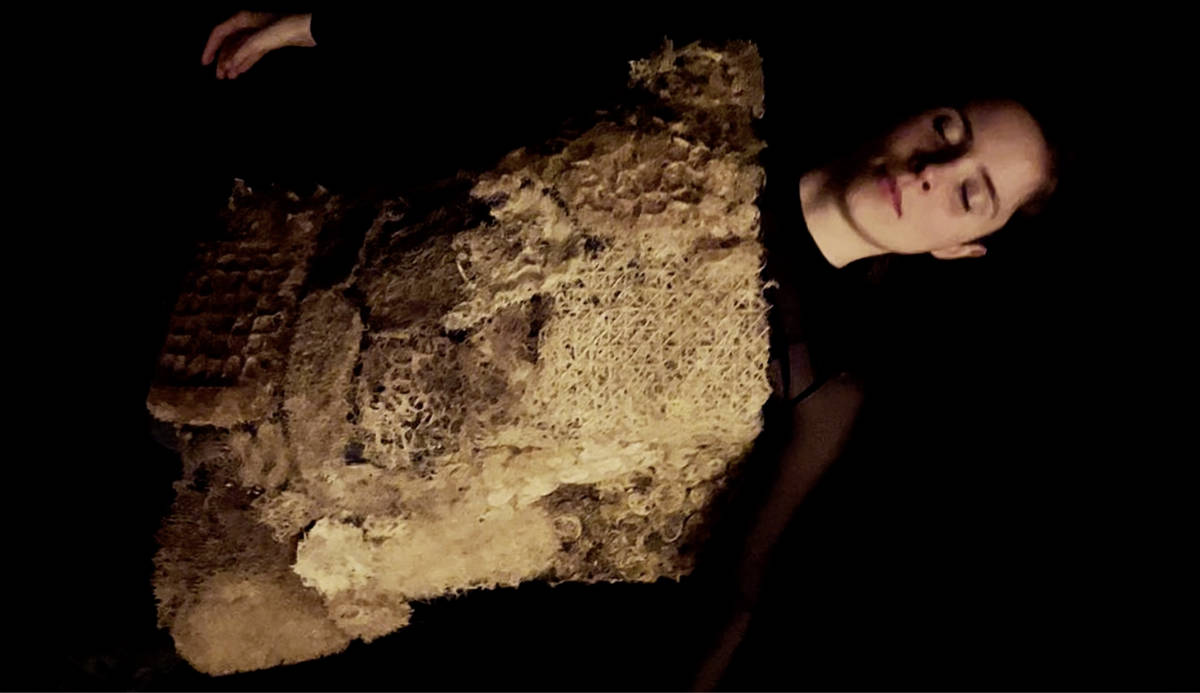 The installation also includes interactive sensors that activate a projection of growing seeds when visitors approach the root structure, allowing the work to respond to presence and touch.