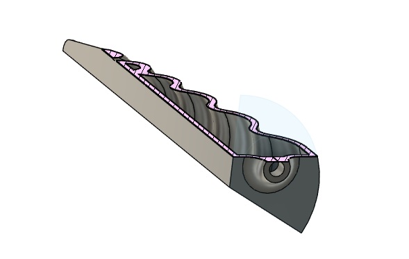 Since the piece is hollow, it was necessary to create 2 parts and then sticking them together, we have the base which has a 120° angle and the grooves for the round divisions, and the rounded geometry which is the revolved profile. We have to think of each mold in two parts also. The first mold hast the base profile extruded by 2mm for the desired thickness, and a flat piece that goes on top and makes sure that all the geometry is filled with silicone. I designed some steps on the edge of each piece so we could use butterfly clips for applying pressure.