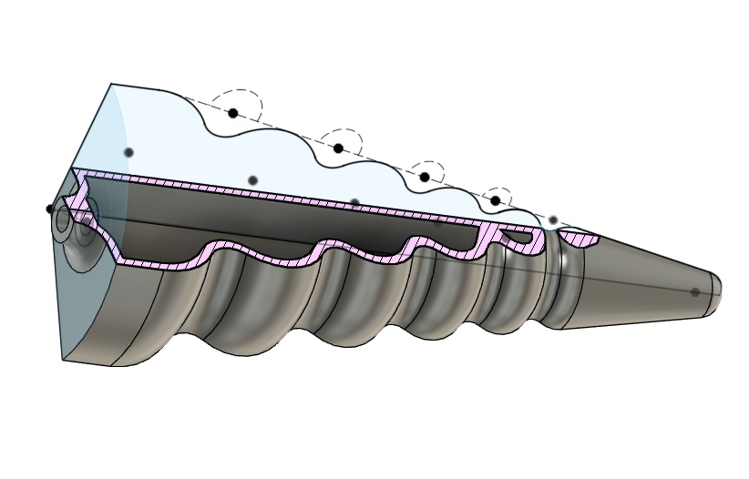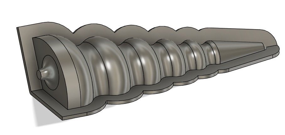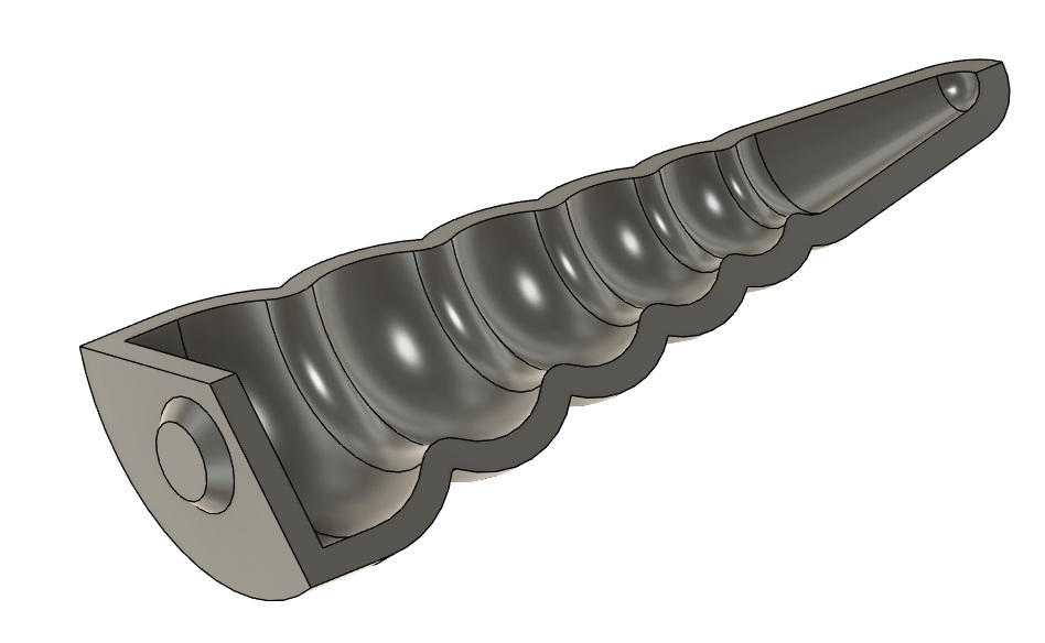 Inspiration for the first piece came from tentacles, specifically a mechanical tentacle controlled by 3 servos and wire (this one over here) and thought that maybe with the appropiate geometry, the same could be acomplished with soft robotics. Three concentric pieces could, in theory, create an omnidirectional tentacle. The design process was very straight-forward, it was a tentacle, with round divisions, divided in 3, with a spout for air at the top.