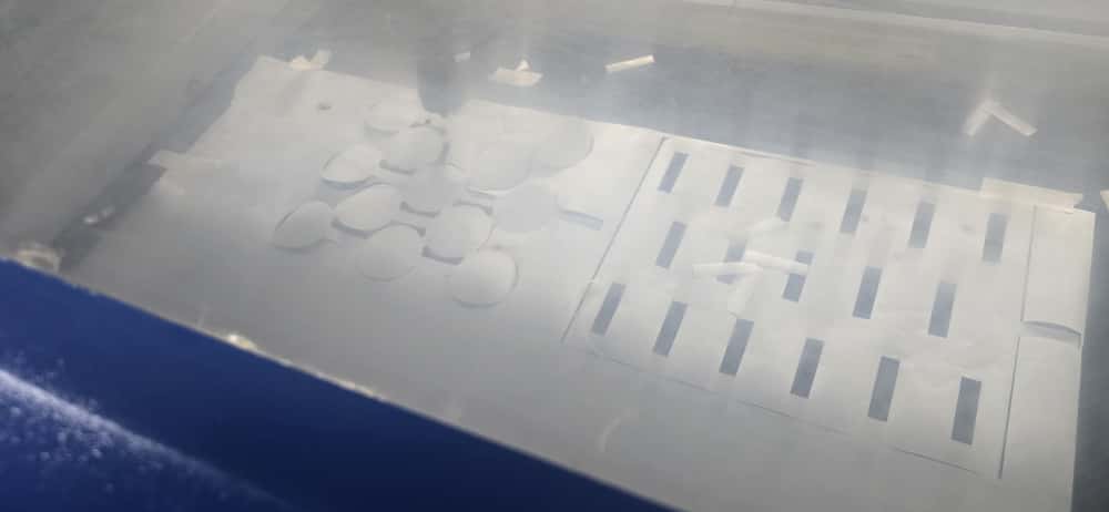 The areas covered with wax paper won't stick so the air will flow there, and everything will retract, creating volumes. So I designed the wax parts on Fusion 360, which then were cut on wax paper using the laser cuter, and finally ironed with a sublimation iron-press sandwiched between two pieces of textile vinyl.