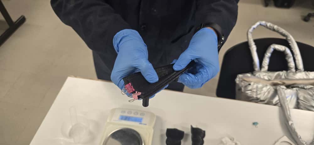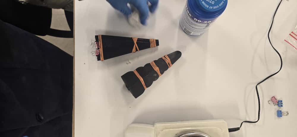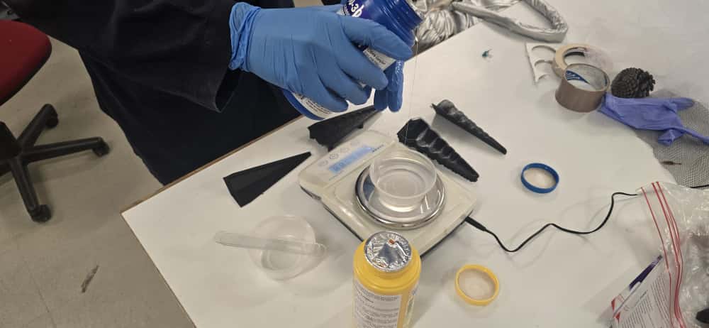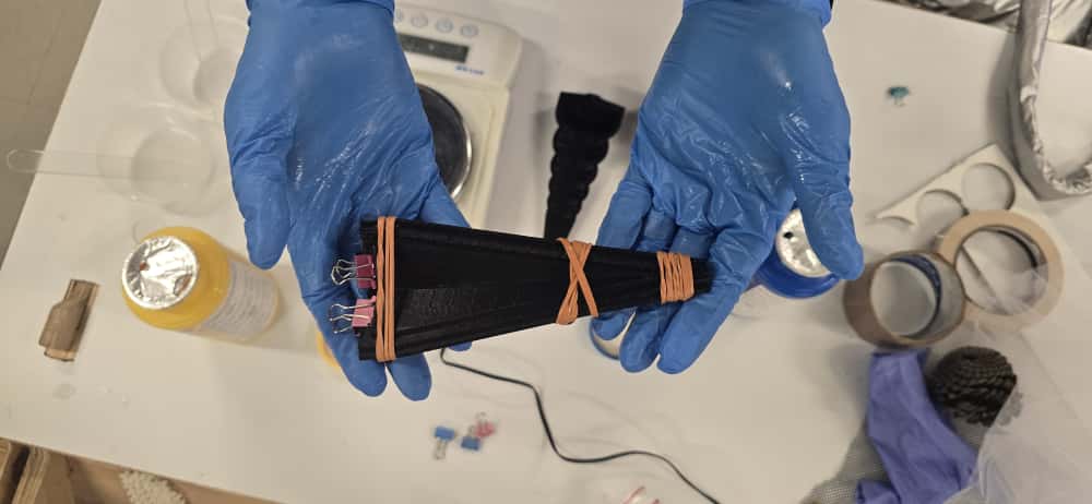 I 3D printed the 4 parts, and added some legs and support so the piece could stay standing up while the silicone is poured. We have Smooth-on Ecoflex 30-00 silicone, which is very flexible and perfect for this kinds of applications. Very easy to use and clean, we mix part A and B on the same measure either by volume or weight, and mix thoroughly, after that we can pour the silicone, in a very thin thread so we avoid as much bubbles as we can, on both base molds, and then apply the top parts, with pressure from the clips and some rubberbands.