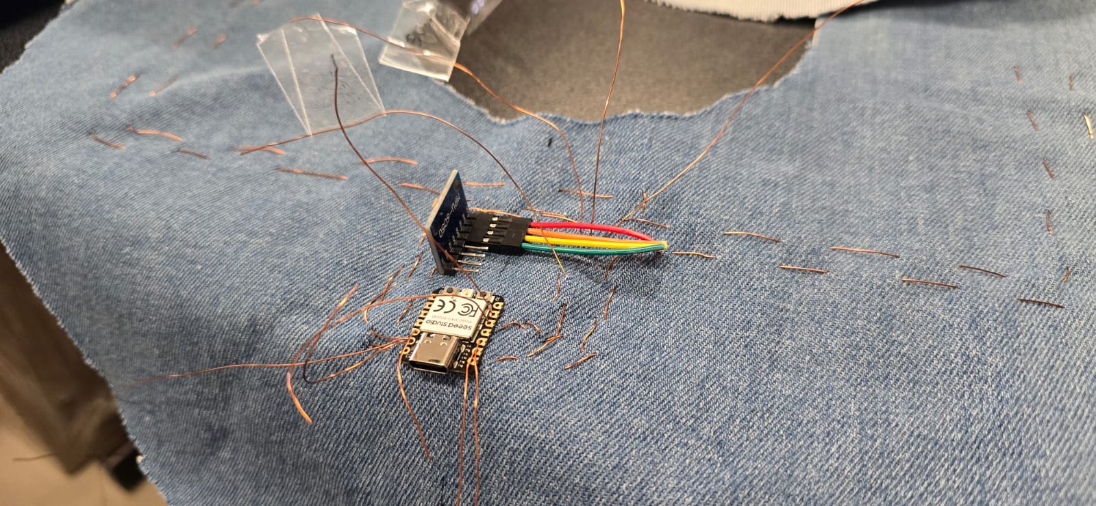 First I threaded and routed the copper wire through the cloth piece, in this case i'm using denim. Then i followed the schematic and optimized the routes. Remember to Label all the terminals because it gets chaotic with this amount of conections (4 routes for data, 1 for voltage and 3 for GND).