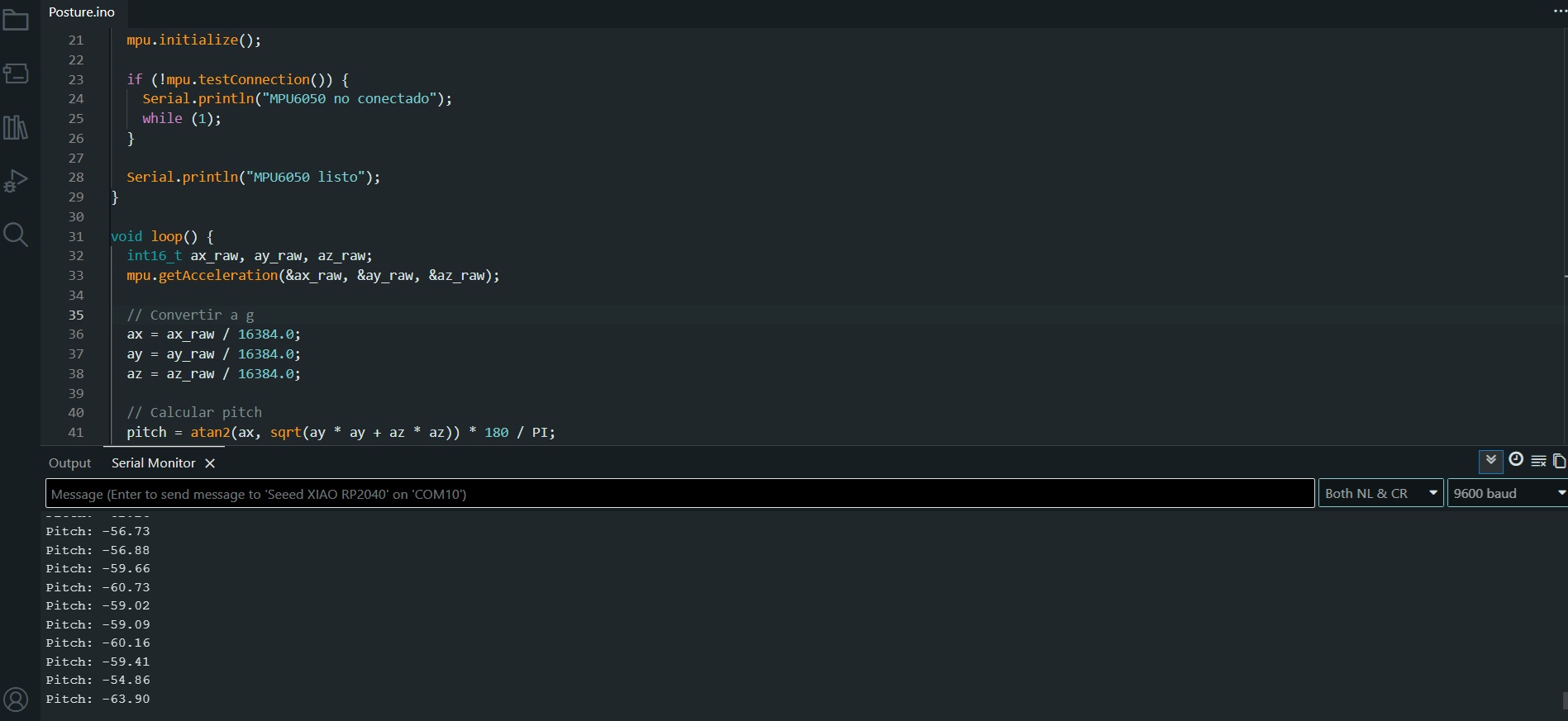 Serial.println("MPU6050 no conectado"); //Over here we have an "error" message in case the module