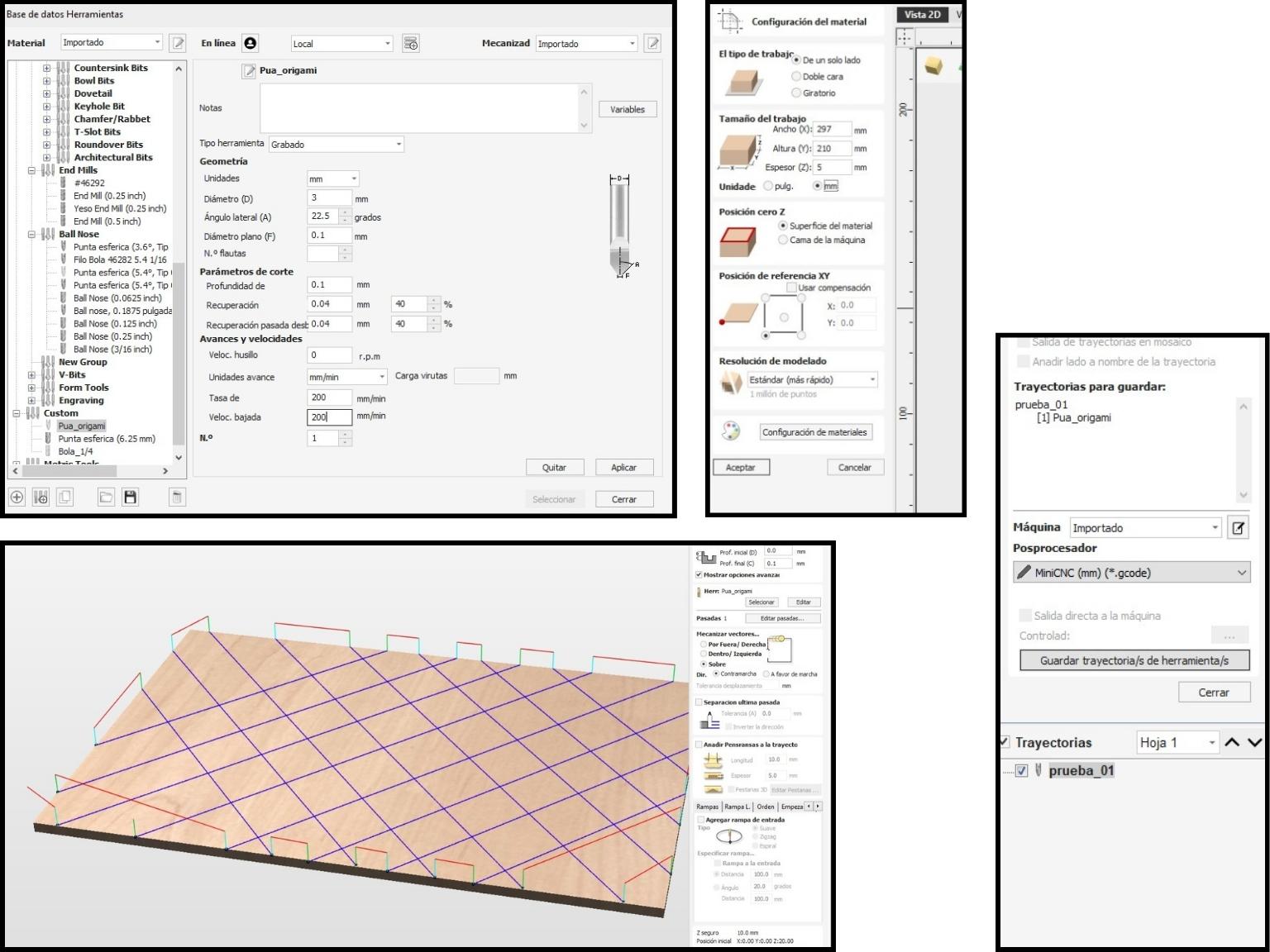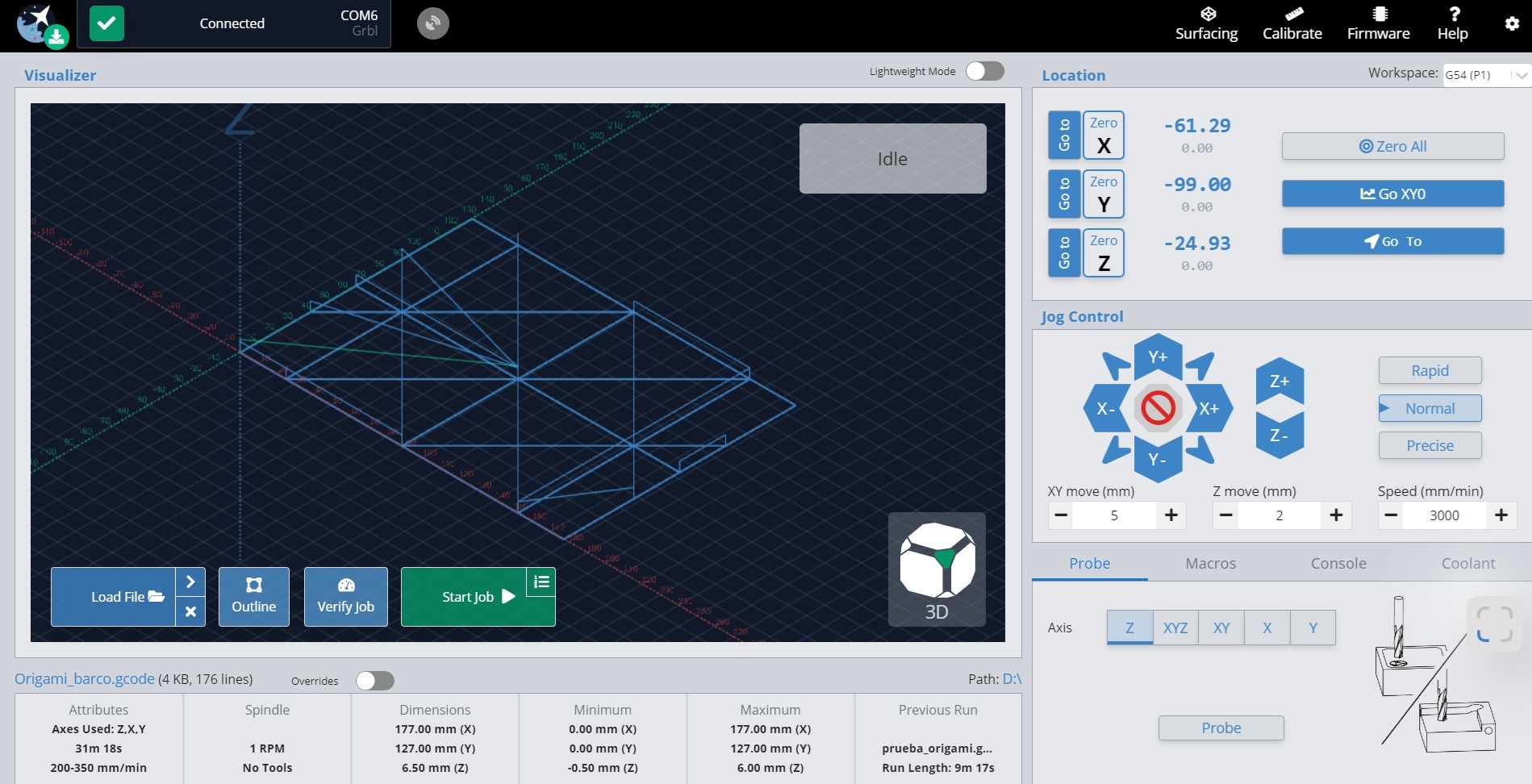 The process was done through Vcarve, using the custom tool we prepared, and sent as .gcode I ran it from the Gsender app, after configuring X, Y and Z axii. There will be 5 passes so the paper is perfectly scored and easy to fold afterwards.