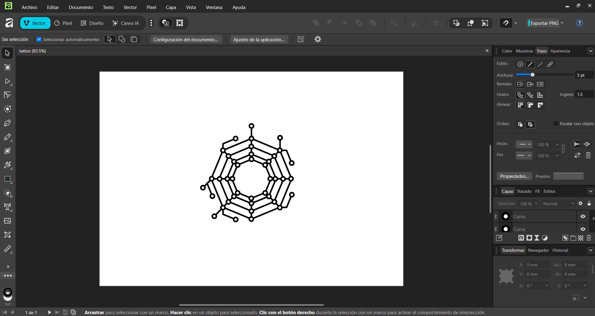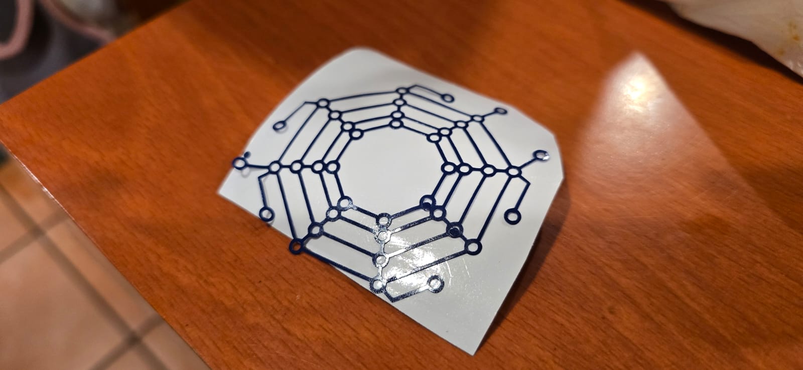 The first part is to design a cool Cyberpunk Tattoo which will surround the NFC tag, I was thinking of either octopi or spider themed, with a tech-aesthetic look. At the end I chose a spider's web with nodes and holes resresembling a circuit. I designed with the vector tools from Affinity Studio, and transformed it into a .png with the combine tool, and Export as PNG.