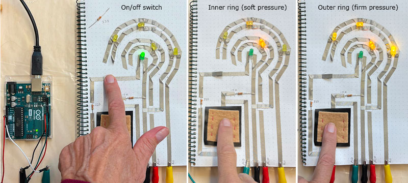Digital switches in a circuit turn an LED on and off (binary). Pressure sensor switches, on the other hand, turn an LED brighter and dimmer, analog style, depending on the amount of resistance (by how firm or gentle the switch is pressed). Soft digital switches can be momentary (on only while pushing “button”), toggled on and off, or initiated via a tilt or stroke sensor.