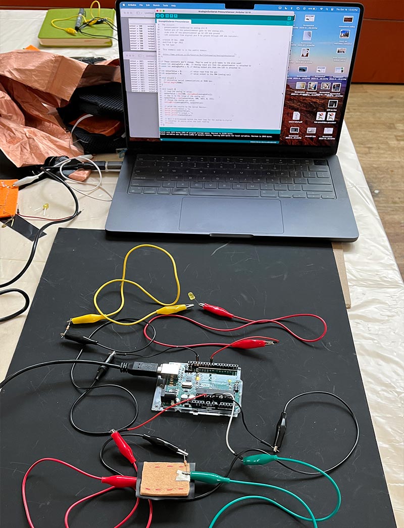 You can set the pressure tolerances in Arduino to control various outputs. Since I couldn’t find a microphone to sense “blowing” on a dandelion, I decided to simulate the action by lighting up concentric rings of dandelion seeds flying off. The on/off snap switch turns on the dandelion, and medium and hard pressure on the analog switch “blows away” the first and second ring of seeds.