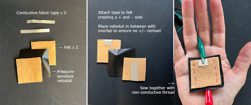 A pressure sensor switch is constructed using a piece of pressure-sensitive velostat sandwiched between squishy fabric layers (thick felt or foam with holes) fashioned with conductive tape. Velostat is a piezoresistive material: It’s electrical resistance decreases when pressured. The velostat should extend beyond the edges of the fabric, and the top and bottom tape must not touch each other.