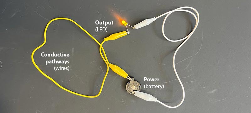 The most basic elements of a circuit include power (e.g. a battery), conductive pathways (e.g. conductive wire, tape, fabric), and an output (e.g. an LED light).