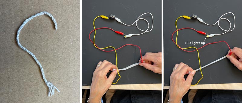Analog switch sensors operate along a continuum. Rather than having only an on/off state, a continuous signal can take on any value within a specified range, like a dimmer switch. Inputs include pressure, stretch, bend, potentiometer, stretch, accelerometer, and light sensors. Below is an example of a stretch sensor. The sensor is made of non-conductive yarn laced with conductive thread. As you stretch it, the resistance decreases (because there are more conductive threads touching) and the light gets brighter.