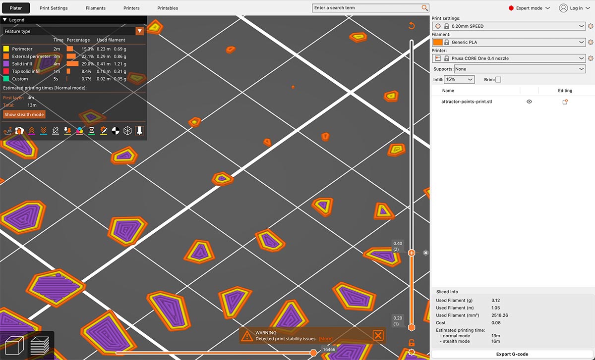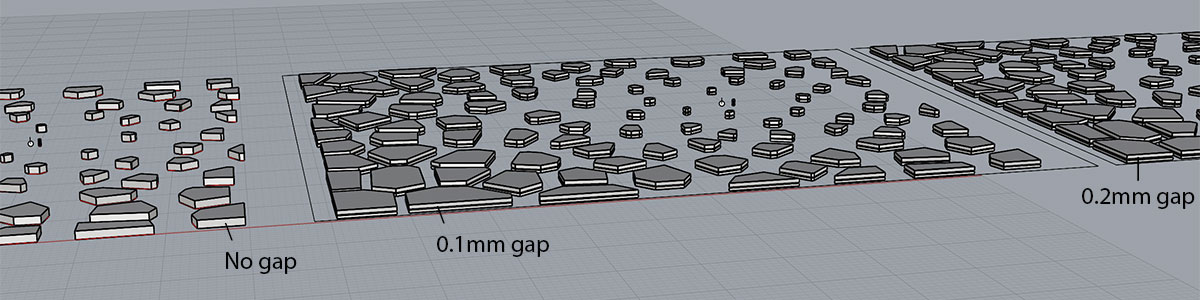 Once I was happy with the pattern and arrangement of shapes created with Grasshopper, I prepared the Rhino file for export. There was a question of whether the print needed to have a gap in order for the 3D printer nozzle to not drag on the mesh fabric. So, I prepared test files with no gap, a 0.1mm gap, and a 0.2mm gap.