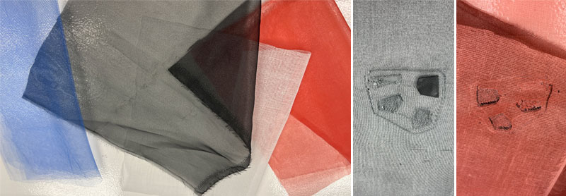 The test prints failed several times using organza fabric. It turns out the 3D printers are very finnicky about fabrics and thicknesses. This photos below show organza and mesh fabrics full of possibility on the left, and a few failed prints on the right.