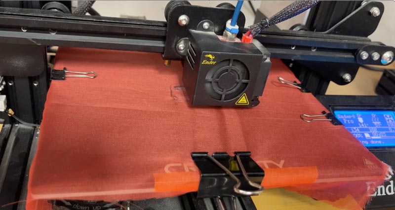 After the first two layers of filament are printed, the fabric is carefully secured to the 3D printer bed, then printing resumes: