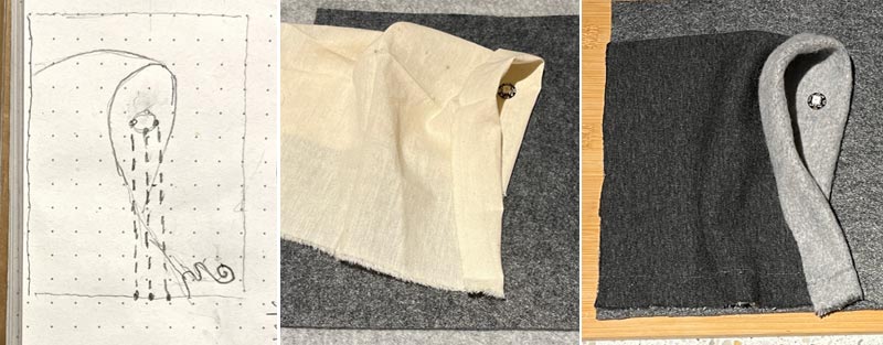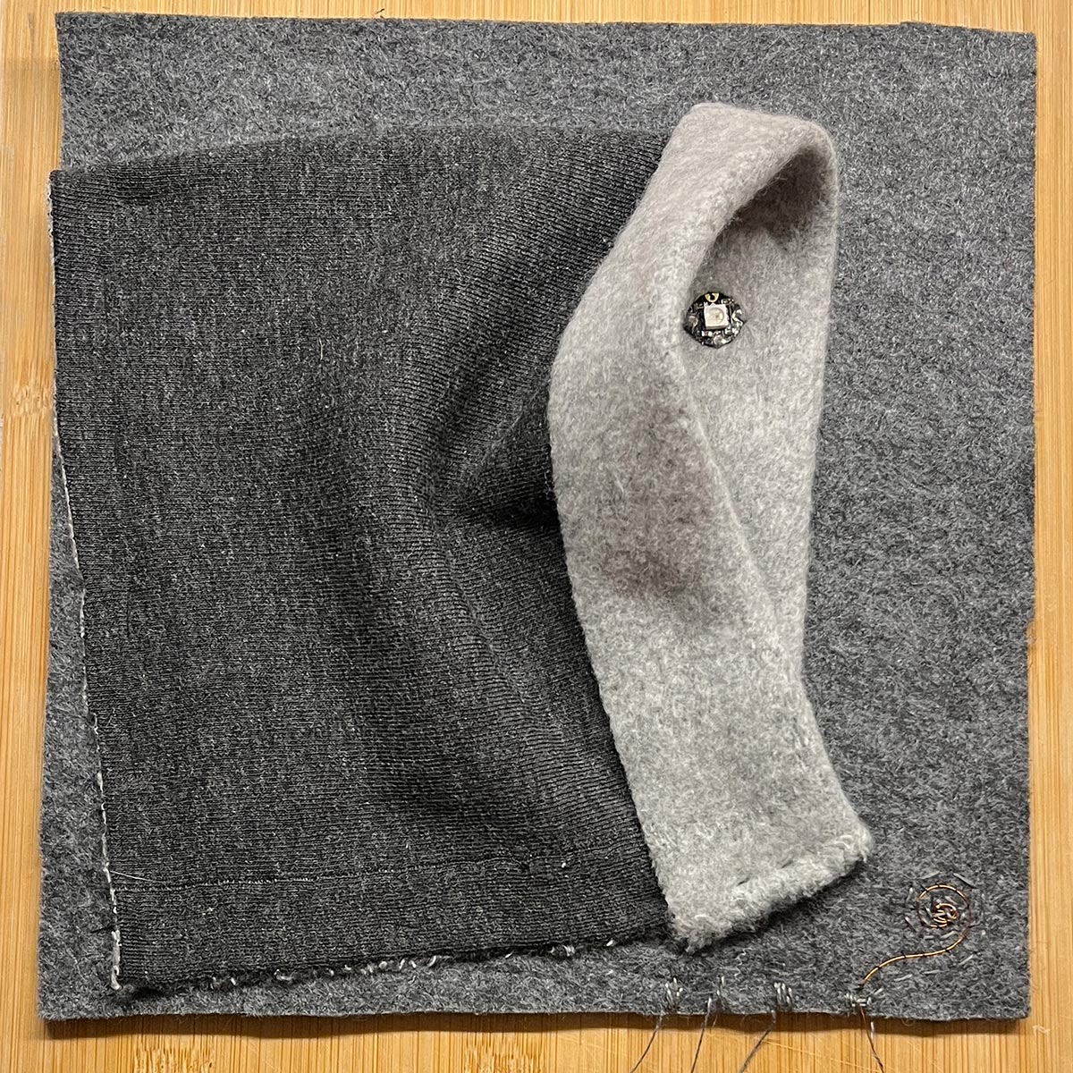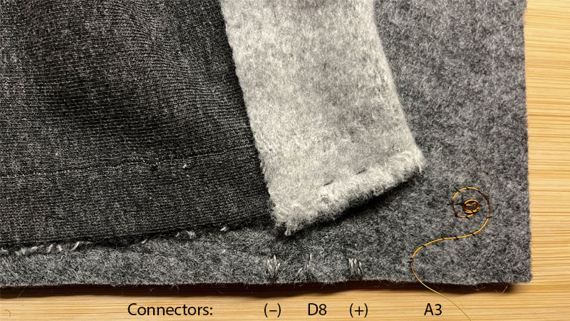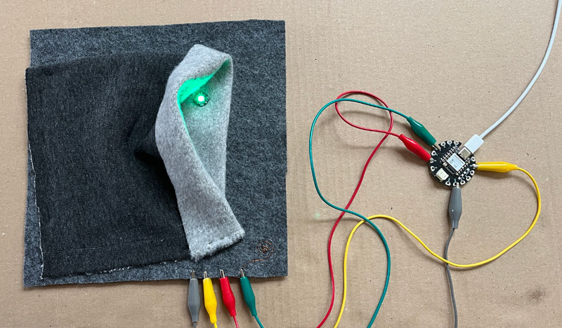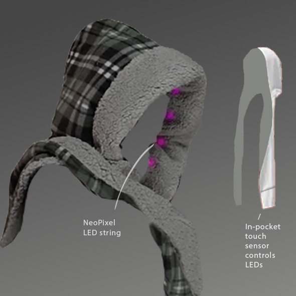 This swatch represents the potential for a full-scale version of a hoodie scarf with a NeoPixel LED string inside the hood, and a touch sensor in the pocket at the end of the scarf. As a proof of concept, the sensor is currently coded to change from green to blue when you touch it, but variations can happen based on the intent, for example, a holiday-themed color palette, or just pure color fun. V2 would have options for the wearer to customize.